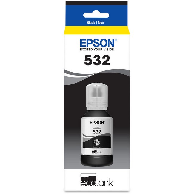 Exclusive, uniquely keyed, EcoFit ink bottle makes it easy to fill each colour tank with Genuine Epson Ink that delivers reliable performance and brilliant results. Epson strongly recommends the use of genuine ink to ensure optimal print quality and performance. Use of non-genuine ink could cause damage not covered under the printer's limited warranty. This standard-capacity bottle of supertank printer ink is designed to fit Epson WorkForce ST-M1000 Monochrome Printer, WorkForce ST-M3000 Monochrome MFP Supertank Printer, EcoTank ET-M1170 Wireless Monochrome All-in-One Supertank Printer, EcoTank ET-M2170 Wireless Monochrome All-in-One Supertank Printer and EcoTank ET-M3170 Wireless Monochrome All-in-One Supertank Printer. It yields approximately 6.000 pages.