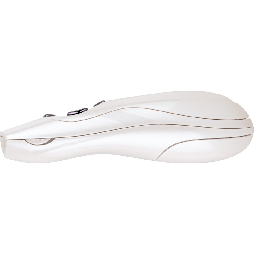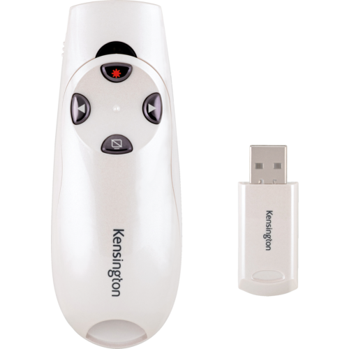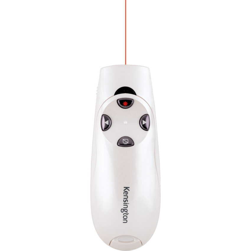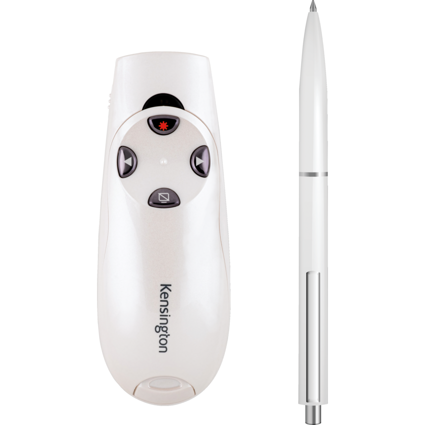Highlight any area of a presentation with a bright red laser at the touch of a button. Intuitive, four-button layout to forward and back slides, hide screen and use the red laser pointer. Internal receiver storage. AES 128-bit encryption. Range up to 150'. 2.4 GHz wireless technology. Pearl White.