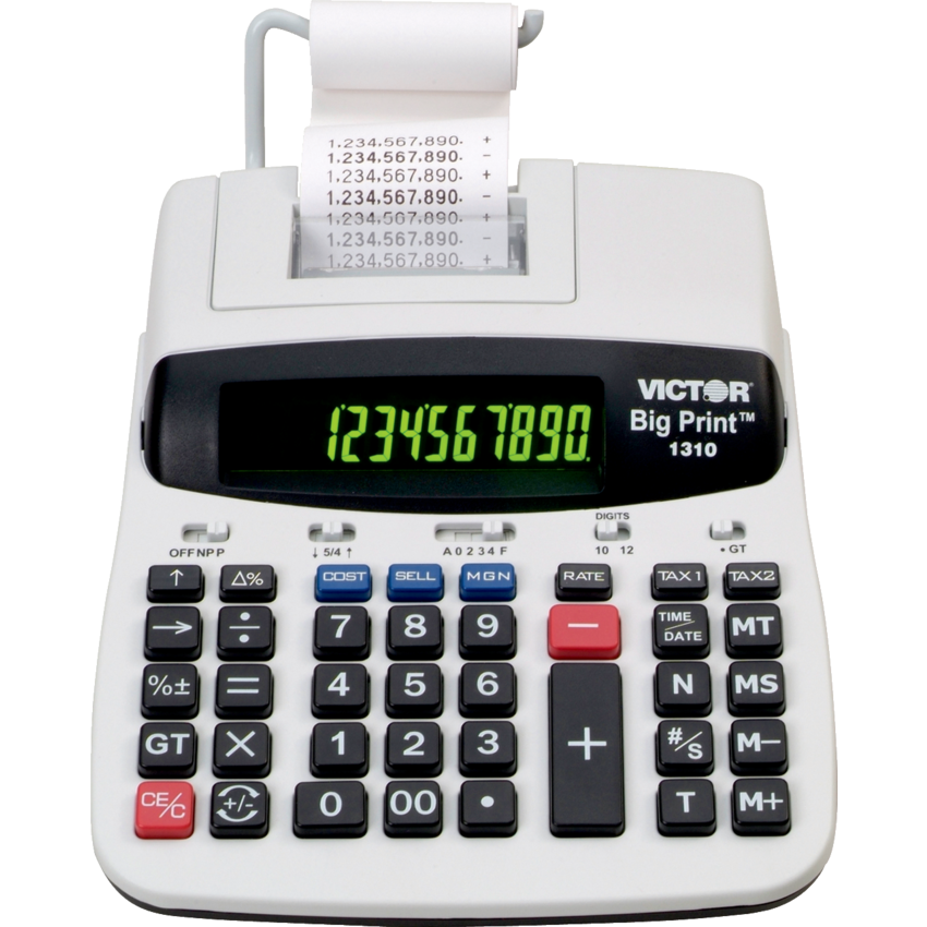 AC power. 10 digits for Big Print™, 12 digits for normal print. 2-colour dot matrix display. Prints 6 lines per second. 2 sizes of printout. Cost/sell/margin calculations. Tax functions. Clock/calendar functions. Big Print™ prints 150% larger. 7-1/2"W x 9-1/2"D x 2-13/64"H.