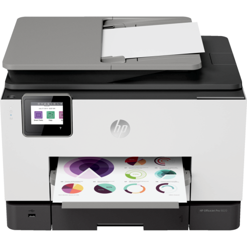 Print, copy, scan, fax. 24 ISO ppm black, 20 ISO ppm colour. 1200 x 1200 dpi printer. 1.2 GHz processor. First page out in 10 seconds. 1-USB 2.0, 1-Host USB, Ethernet, 1-Wireless 802.11b/g/n, 2-RJ-11 modem ports. 512 MB memory. ADF 8.5" x 14" Maximum, 5" x 5" Minimum, 2.65" touchscreen. Copier resize 25-400%. Duplex printing. 250 sheet letter/legal tray. 1-year limited warranty.