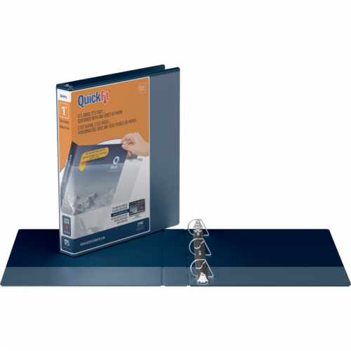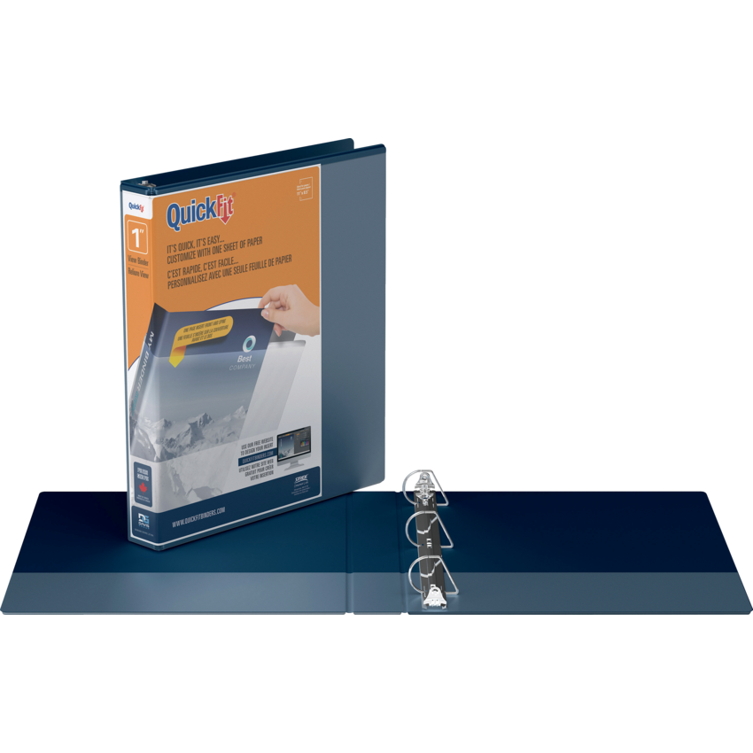 Customize the front cover and spine at the same time with a wraparound, easily loaded sheet. Rings mounted on back to allow pages to lie flat. See quickfitbinders.com for easy to use templates. Features ink transfer-resistant overlay. Interior front and back cover pockets. PVC free polypropylene material. 1" capacity. Navy Blue. Also available in a carton of 20.