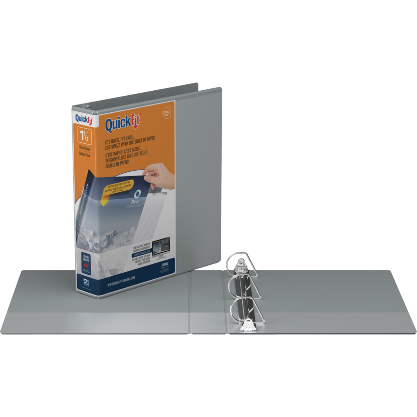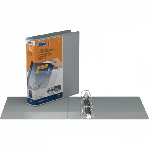 Customize the front cover and spine at the same time with a wraparound, easily loaded sheet. Rings mounted on back to allow pages to lie flat. See quickfitbinders.com for easy to use templates. Features ink transfer-resistant overlay. Interior front and back cover pockets. PVC free polypropylene material. 1-1/2" capacity. Grey. Also available in a carton of 14.
