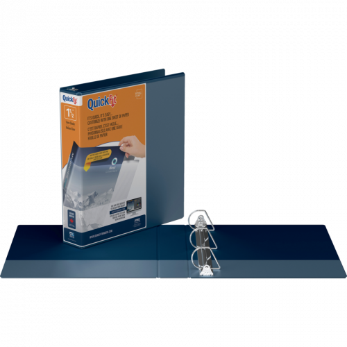 Customize the front cover and spine at the same time with a wraparound, easily loaded sheet. Rings mounted on back to allow pages to lie flat. See quickfitbinders.com for easy to use templates. Features ink transfer-resistant overlay. Interior front and back cover pockets. PVC free polypropylene material. 1-1/2" capacity. Navy Blue. Also available in a carton of 14.