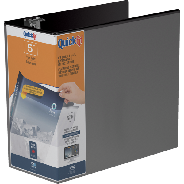 Customize the front cover and spine at the same time with a wraparound, easily loaded sheet. Rings mounted on back to allow pages to lie flat. See quickfitbinders.com for easy to use templates. Features ink transfer-resistant overlay. Interior front and back cover pockets. PVC free polypropylene material. 5" capacity, with locking rings. Black. Also available in a carton of 6.
