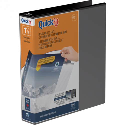 Customize your front cover and spine at the same time with a wrap around sheet. Back mounted rings allow pages to lie flat. Contains a minimum of 40% post-consumer recycled material. See www.quickfitbinders.com for easy to use templates. Features 2 inside pockets and an ink transfer-resistant overlay. 1-1/2" capacity. PVC free polypropylene material. Black. Also available in a carton of 14.