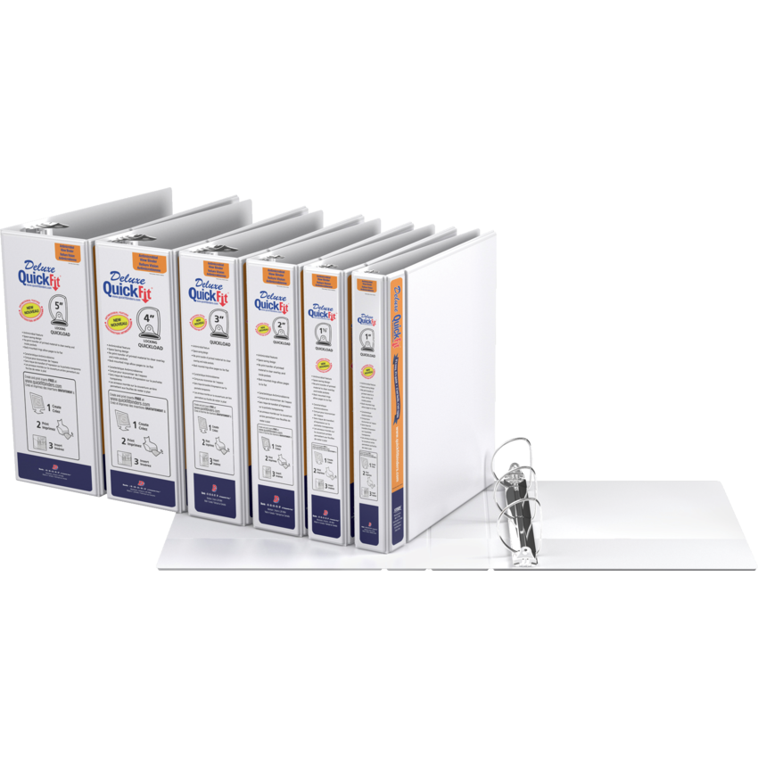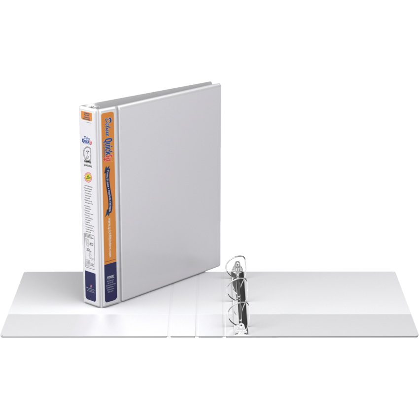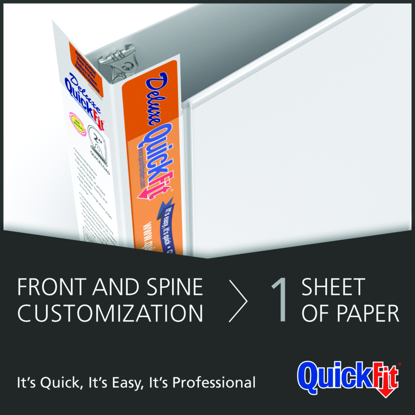 Customize the front and spine with a single, letter size sheet. Double hinged front cover saves space on shelf and is more durable. The Quickload rings have minimal curve for easy loading. Back mounted rings allow pages to lie flat. Contains a minimum of 36% post-consumer recycled material. See www.quickfitbinders.com for easy to use templates. Features ink-transfer resistant overlay. Interior front and back cover pockets. Polypropylene. 1" capacity. White. Also available in a carton of 12.