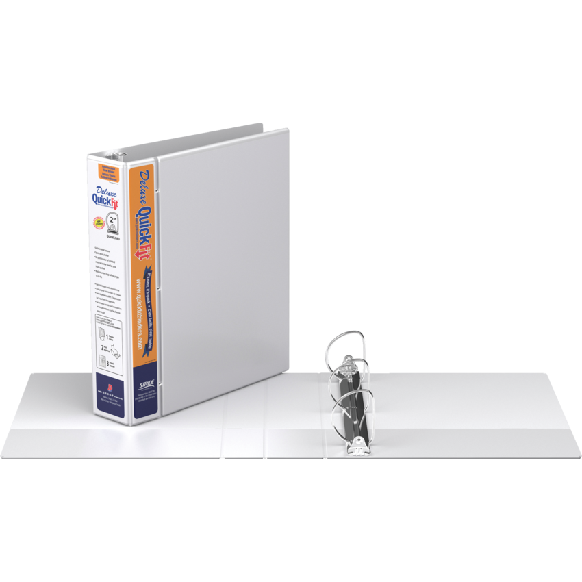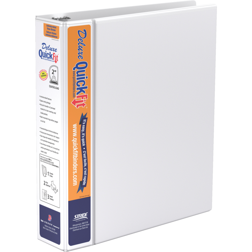 Customize the front and spine with a single, letter size sheet. Double hinged front cover saves space on shelf and is more durable. The Quickload rings have minimal curve for easy loading. Back mounted rings allow pages to lie flat. Contains a minimum of 36% post-consumer recycled material. See www.quickfitbinders.com for easy to use templates. Features ink-transfer resistant overlay. Interior front and back cover pockets. Polypropylene. 2" capacity. White. Also available in a carton of 6.
