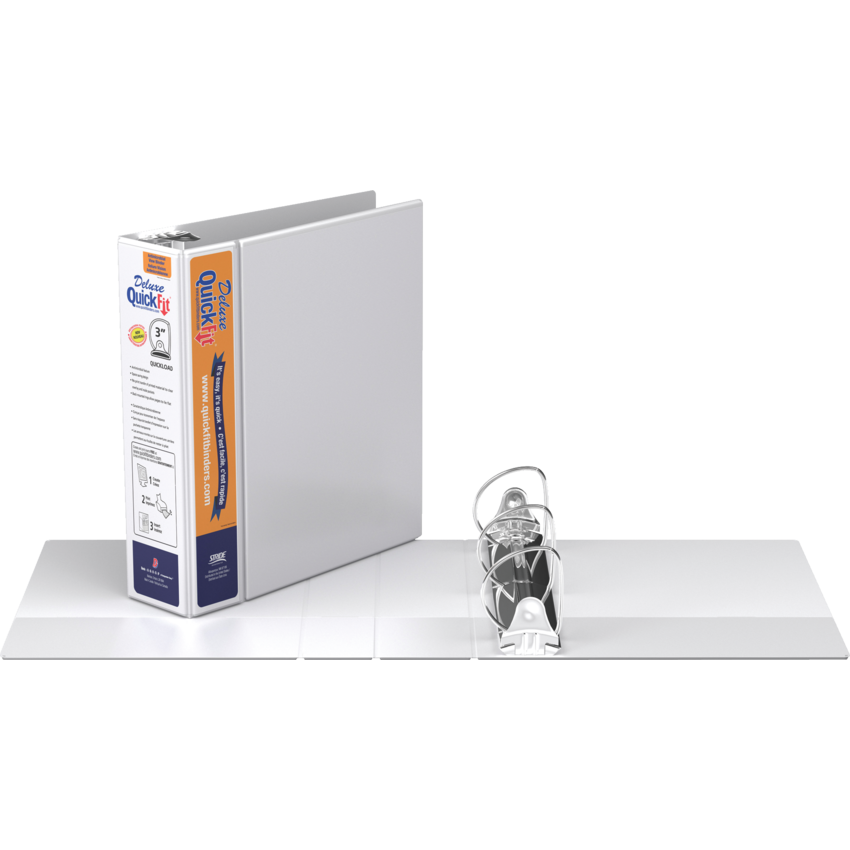 Customize the front and spine with a single, letter size sheet. Double hinged front cover saves space on shelf and is more durable. The Quickload rings have minimal curve for easy loading. Back mounted rings allow pages to lie flat. Contains a minimum of 36% post-consumer recycled material. See www.quickfitbinders.com for easy to use templates. Features ink-transfer resistant overlay. Interior front and back cover pockets. Polypropylene. 3" capacity. White. Also available in a carton of 6.