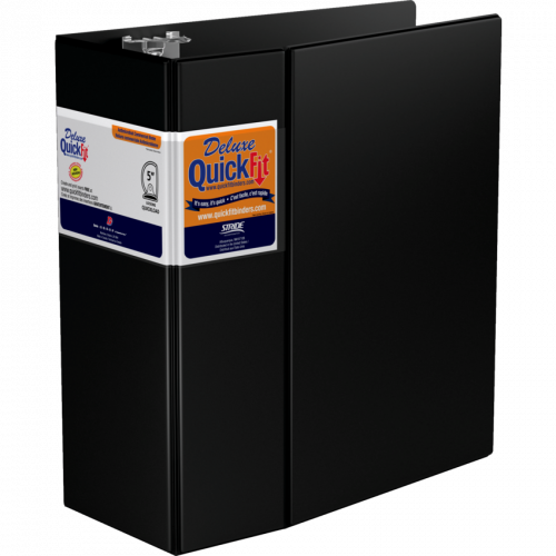 Unique overlay design allows a single sheet to create a one-piece custom insert that wraps around spine to front cover. Space saving design, double hinged cover takes up less space on a shelf. Interior front and back cover pockets. Back mounted rings allow pages to lie flat. See www.quickfitbinders.com for easy to use templates. Locking angled rings. 5'' capacity. Polypropylene material. Black. Also available in a carton of 6.