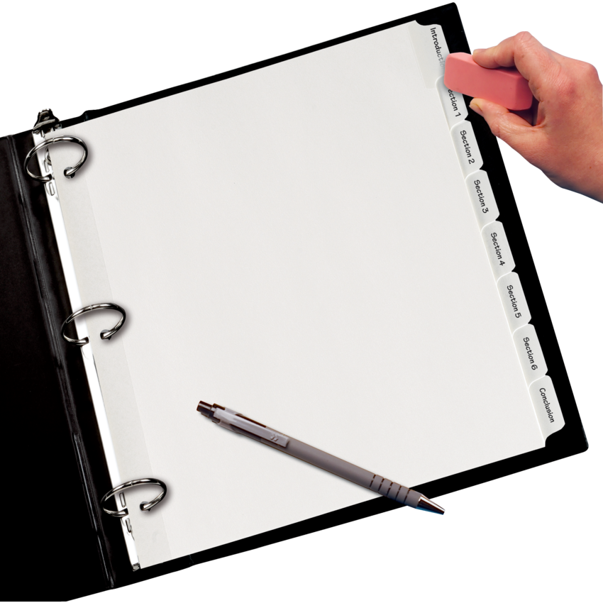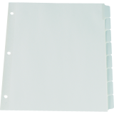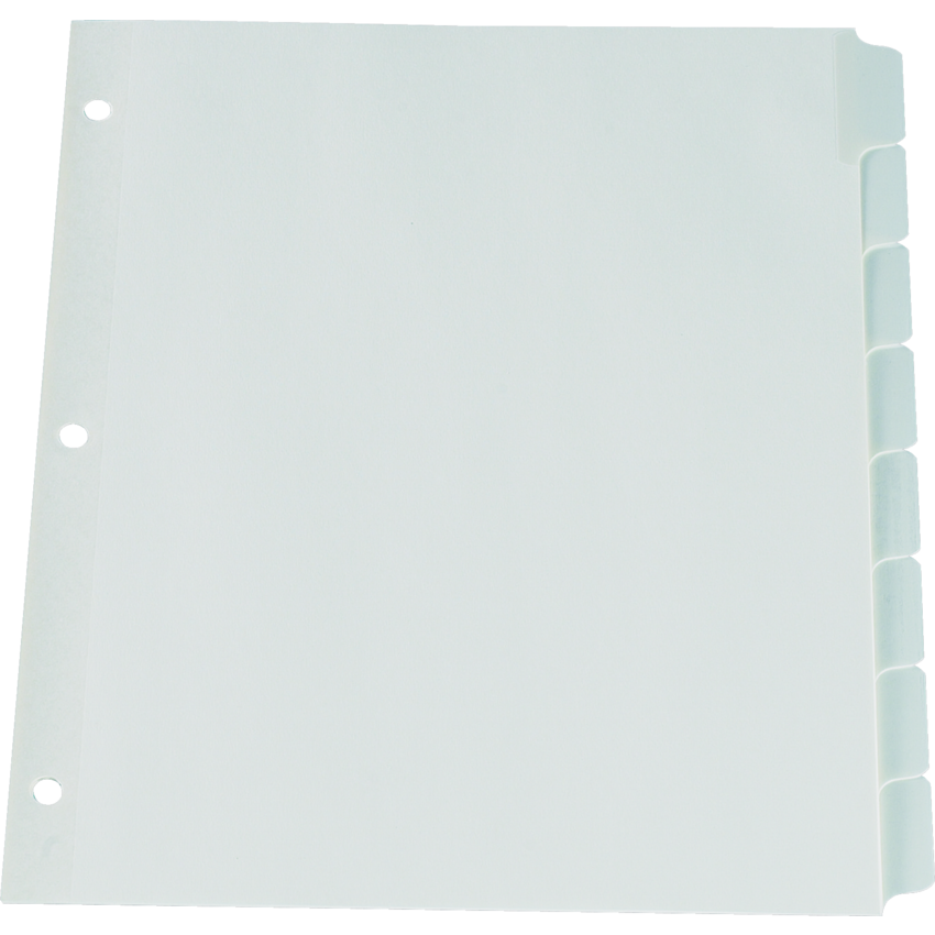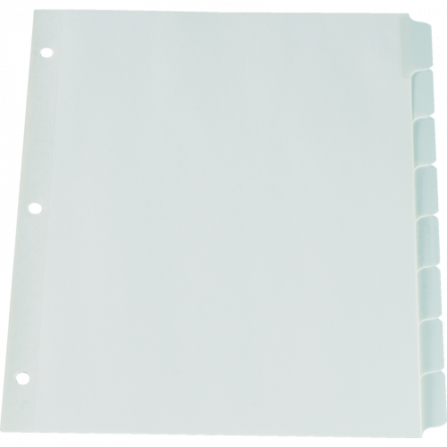 Dividers are made of heavy duty, 7 pt. index stock. Tabs and binding edge are reinforced with clear, rip-proof plastic. Tabs feature a write-on, matte finish surface that eliminates smudging. Contains a minimum of 10% post-consumer recycled material. 11” x 8-1/2”. 8 tabs. White.