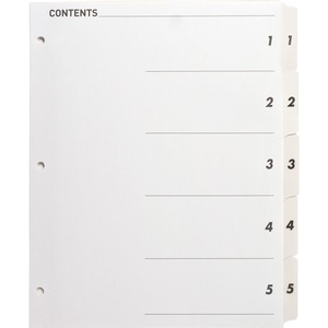 Make organization quick and easy using a black/white Table of Contents page that coordinates with included dividers with numbered tabs. Key in or type section titles and then print or copy onto the Table of Contents page preprinted with numbers that match the dividers. Edges and white tabs feature Mylar reinforcement to prevent tearing. Three-hole punched edges allow easy, quick placement into standard-size, three-ring binders. Index dividers are compatible with all laser and inkjet printers and include easy-to-follow instructions.