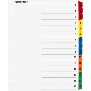 Make organization quick and easy using a black/white Table of Contents page that coordinates with included dividers that have numbered tabs. Key in or type section titles and then print or copy onto the Table of Contents page preprinted with numbers that match the dividers. Edges and brightly colored tabs feature Mylar reinforcement to prevent tearing. Three-hole punched edges allow easy, quick placement into standard-size, three-ring binders. Index dividers are compatible with all laser and inkjet printers and include easy-to-follow instructions.