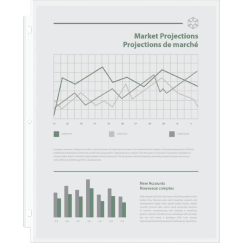 Top-loading sheet protectors let gravity do the work—just drop your sheets neatly into place; with reinforced hole punch strip to resist tears. Contains a minimum of 60% post-consumer recycled content. Matte finish. 3 mil. Holds 50 sheets. Letter size. 50/box.