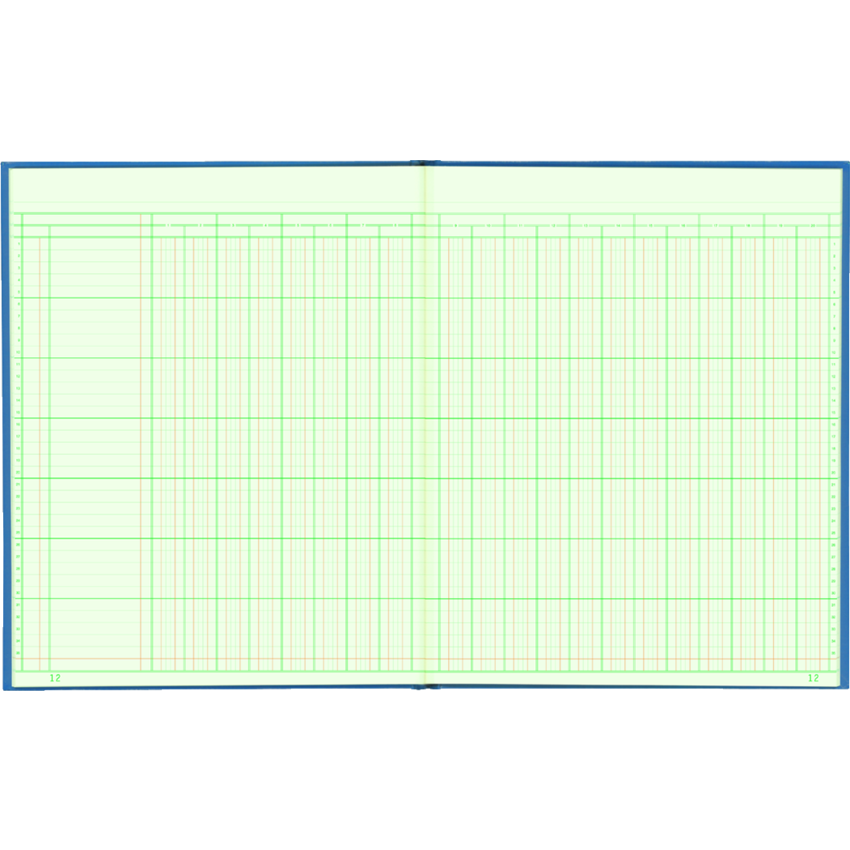 Green tinted paper with green and brown rulings and a perforated, tear-off heading section to eliminate repetitious writing. Contains a minimum of 50% post-consumer recycled material. FSC Certified®. Perfect bound. Hard cover. 20 Columns. Double page. 80 numbered pages. 12-1/4” x 9-7/8”.