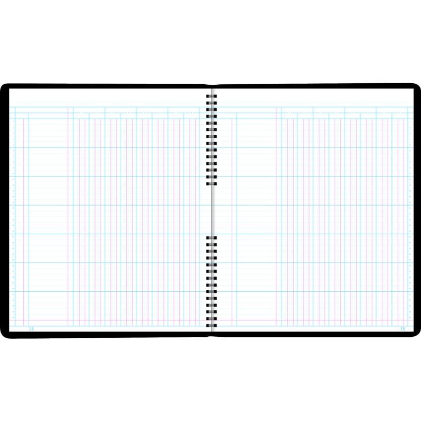 Pages with perforated, tear-off heading section to eliminate repetitious writing. Feint rulings. Contains a minimum of 50% post-consumer recycled material. FSC® Certified. Split twin wire bound. Flexible cover. White paper with red and blue ruling, numbered. 8 Columns. Single page. 80 pages. 12" x 10".