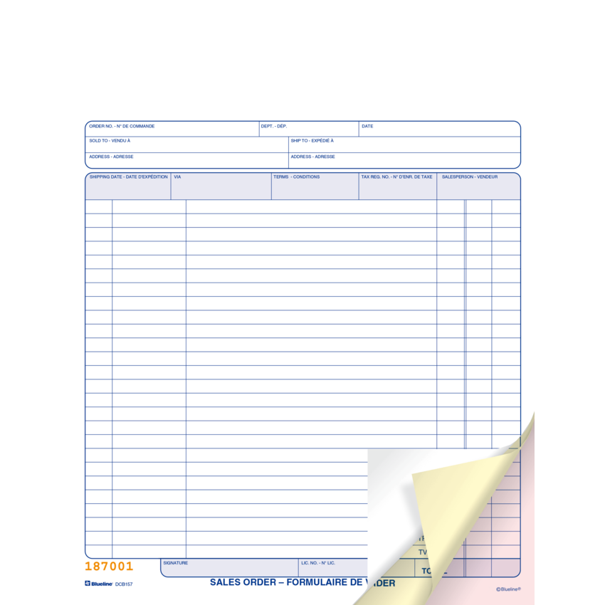 Wraparound cover to prevent write-through on subsequent forms. First copy is white, second copy is yellow, third copy is pink (where applicable). First dimension given is the bound side. 50 numbered sets per book. 3-part. Sales Order Book. 8-1/2" x 11". Bilingual.