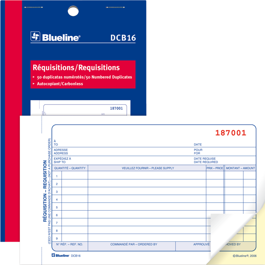 Wraparound cover to prevent write-through on subsequent forms. First copy is white, second copy is yellow, third copy is pink (where applicable). First dimension given is the bound side. Requisition Book. 2-part. 50 numbered sets per book. 4-1/4” x 7”. Bilingual.