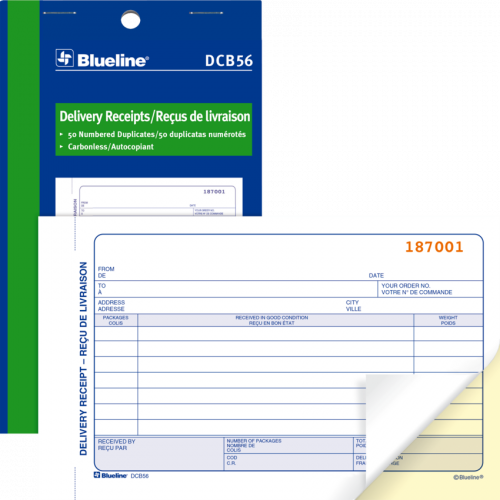 Wraparound cover to prevent write-through on subsequent forms. First copy is white, second copy is yellow, third copy is pink (where applicable). First dimension given is the bound side. Delivery Receipts Book. 2-part. 50 numbered sets per book. 4-1/4” x 7”. Bilingual.
