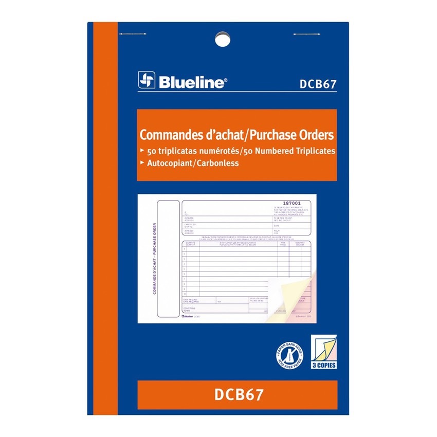 Wraparound cover to prevent write-through on subsequent forms. First copy is white, second copy is yellow, third copy is pink (where applicable). First dimension given is the bound side. 50 numbered sets per book. 3-part. Purchase Order Book. 5-3/8” x 8”. Bilingual.