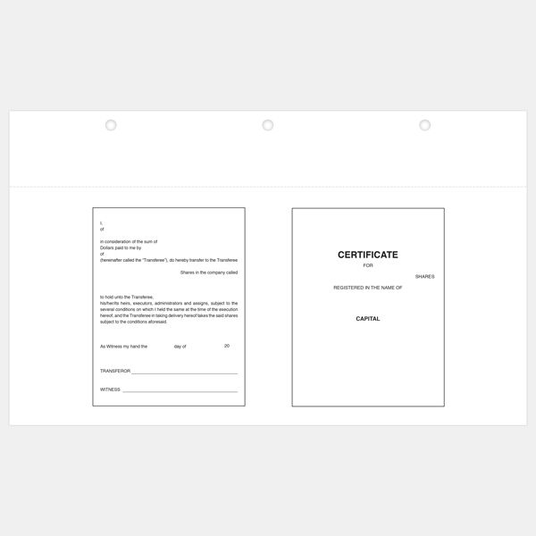 Printed on premium opaque 70# paper, these Share Certificates come already printed with the standard BC wording on the front and back. They are perforated and three hole punched. These certificates are Blue and 8 1/2" x 14" sheet size. Valid only in the province of British Columbia.