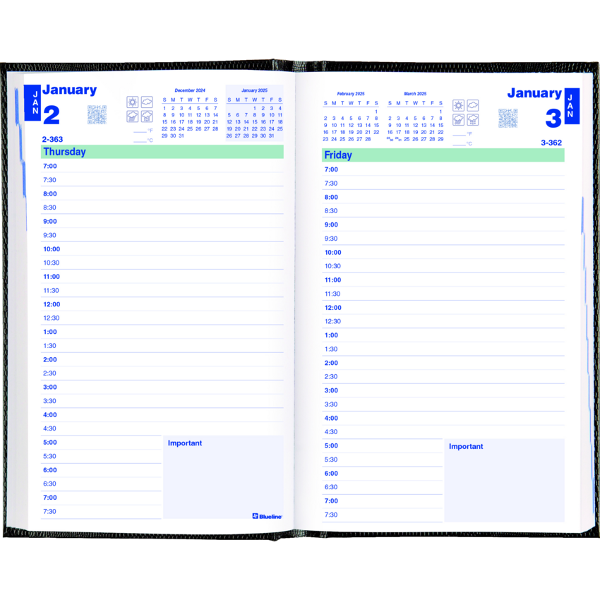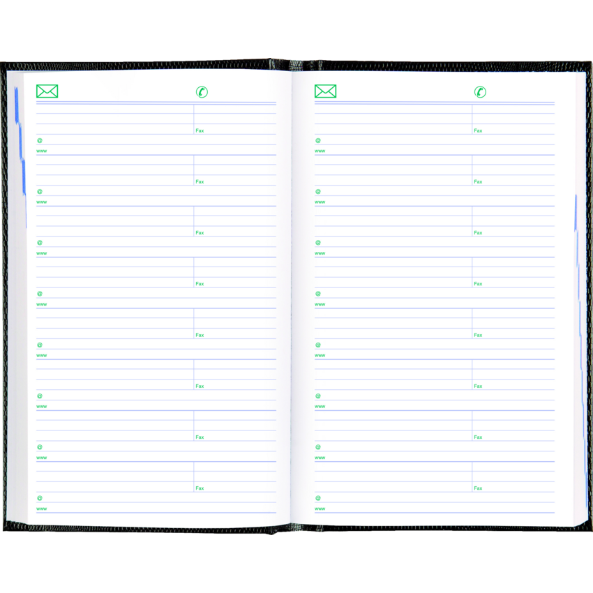 Contains a minimum of 50% post-consumer recycled content. Hard lizard-like cover. Perfect bound. Appointment schedule from 7:00 a.m. to 7:30 p.m. in 1/2 hour intervals. Note box on each page. Monthly expense page at the end of each month. 8" x 5". English. Black.