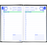 Contains a minimum of 50% post-consumer recycled material. FSC® Certified. Perfect bound. Hard, lizard-like cover. 1 page per day. 7:00 a.m. to 7:30 p.m. in 1/2 hour intervals. Notebox on each page Monthly expense section at the end of each month. 8" x 5". Bilingual. Black.