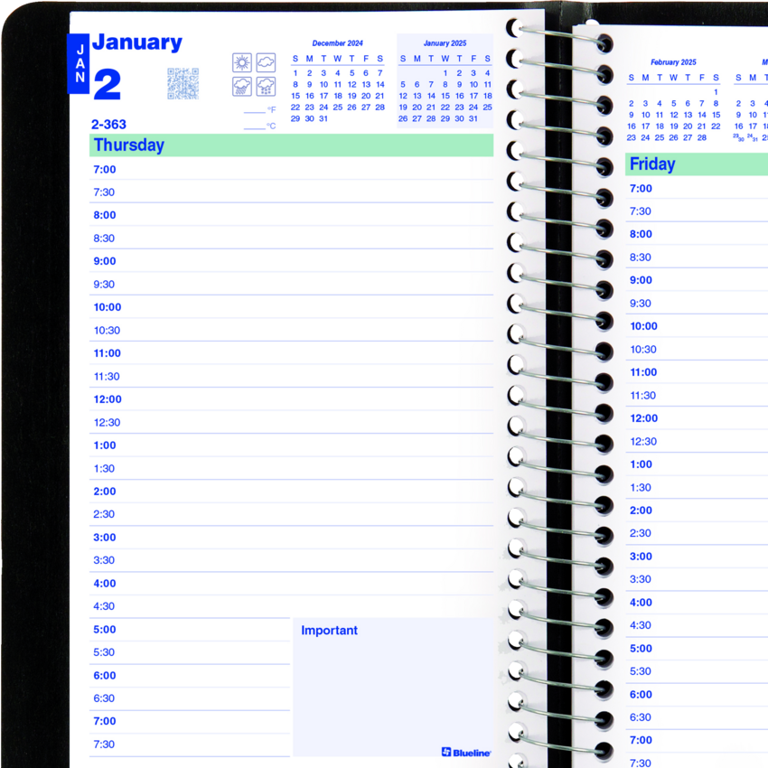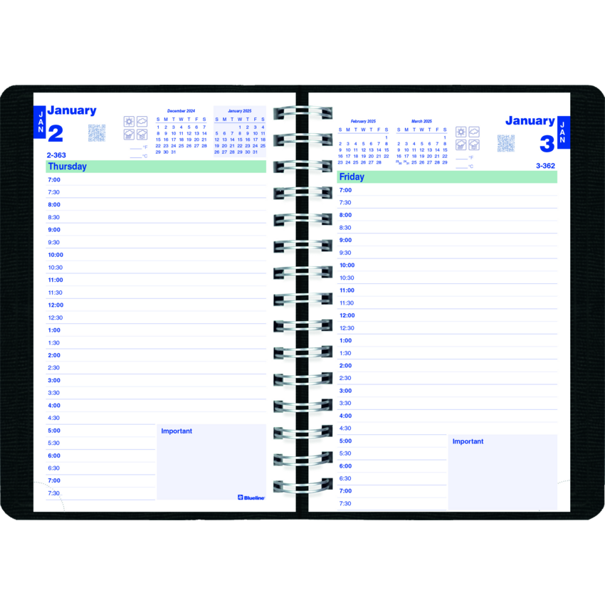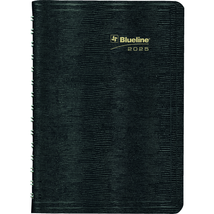 FSC® Certified. Spiral binding. Contains a minimum of 50% post-consumer recycled material. Soft lizard-like cover. Appointment schedule from 7:00 a.m. to 7:30 p.m. in 1/2 hour intervals. Note box on each page. Monthly expense page at the end of each month. 8" x 5". English. Black.