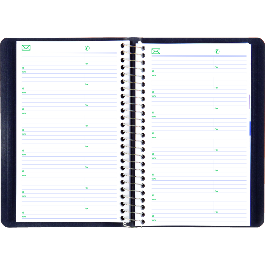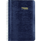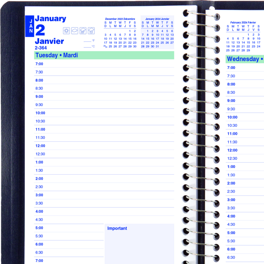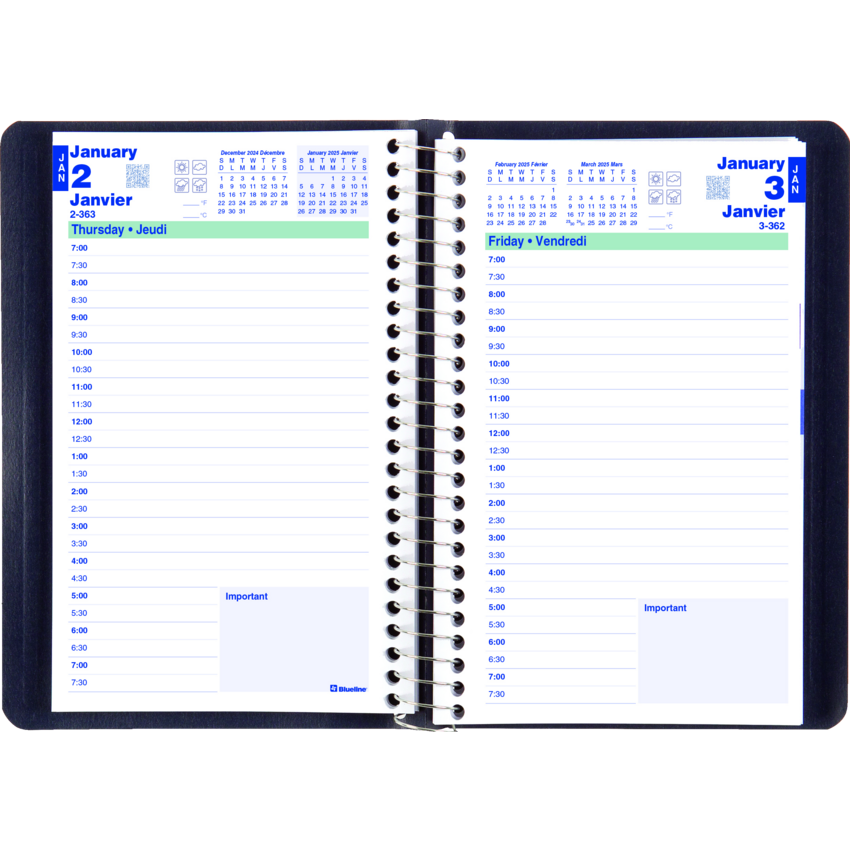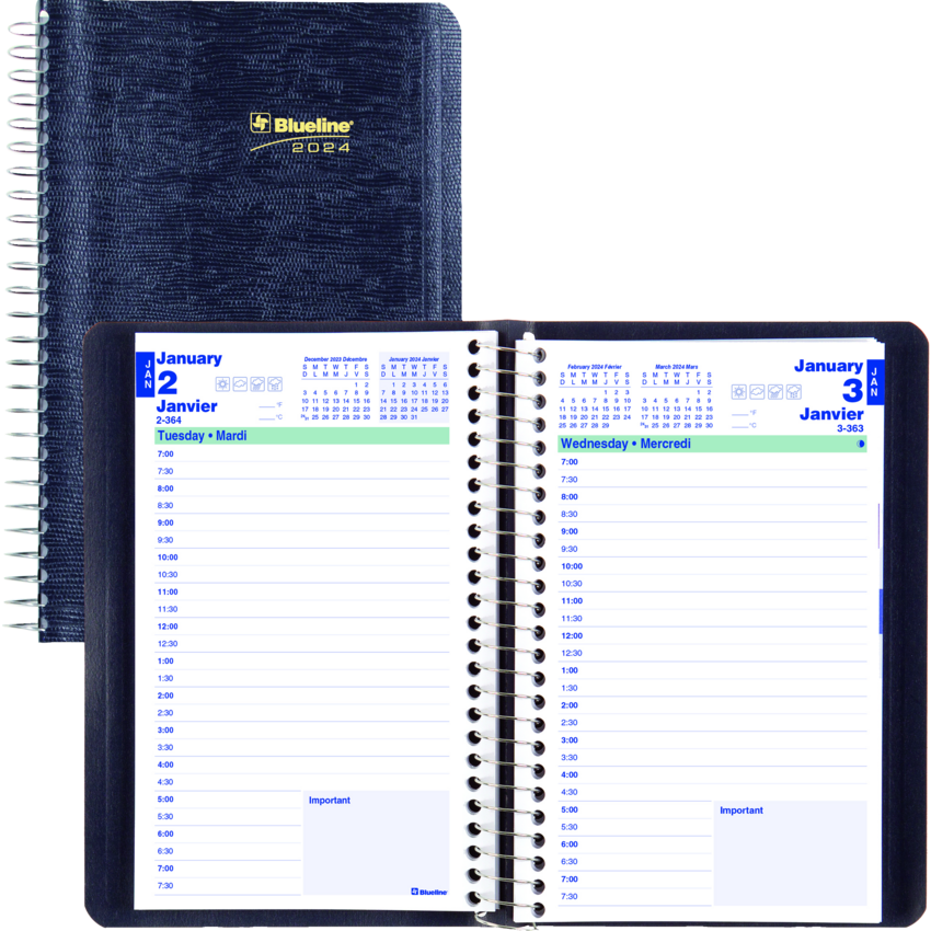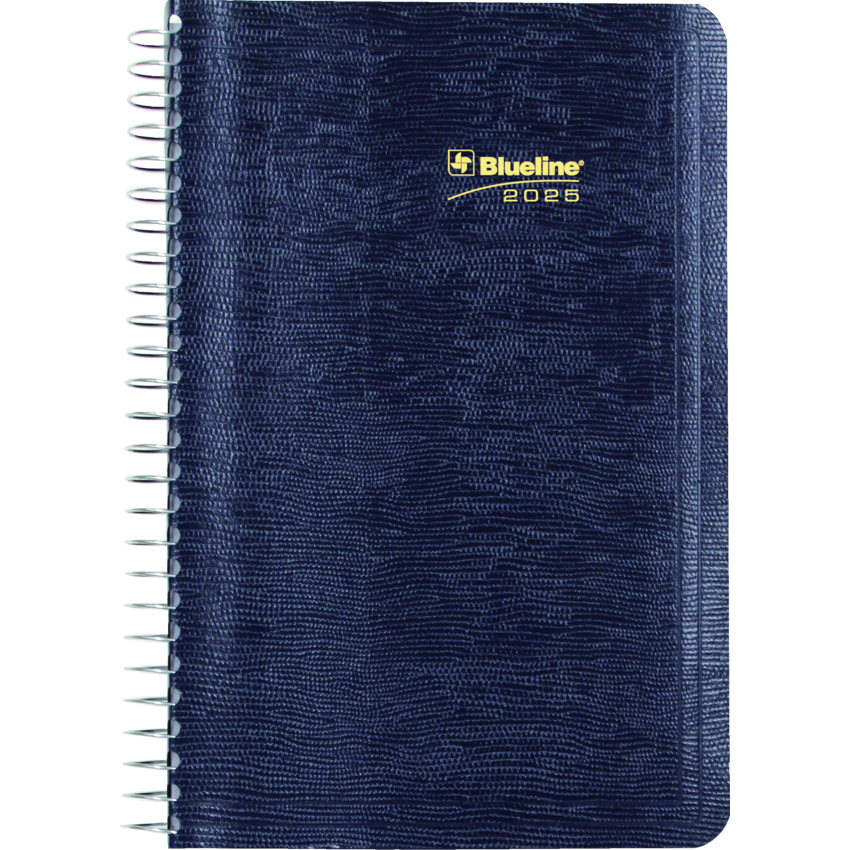 Contains a minimum of 50% post-consumer recycled material. FSC® Certified. Spiral bound. Soft, lizard-like cover. 1 page per day. 7:00 a.m. to 7:30 p.m. in 1/2 hour intervals. Note box on each page. Monthly expense section. 8" x 5". Bilingual. Blue.