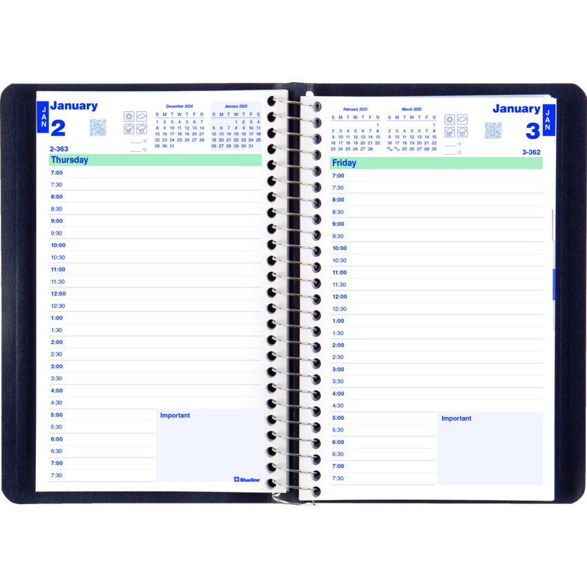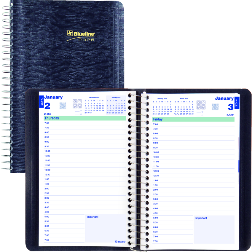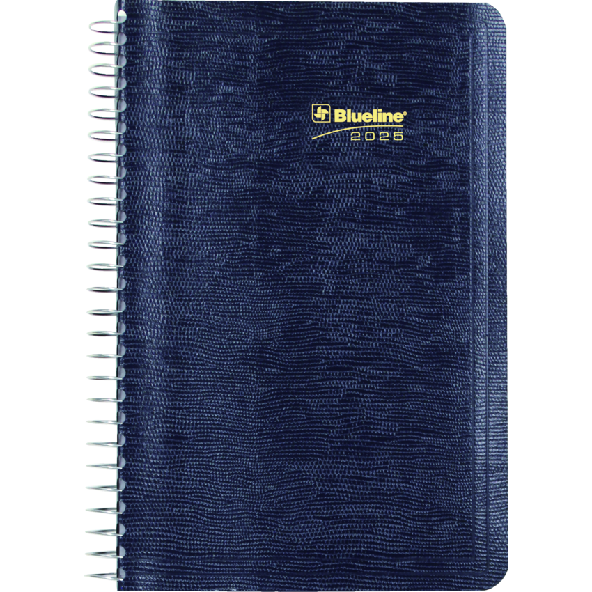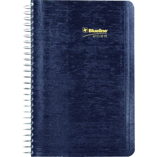 FSC® Certified. Contains a minimum of 50% post-consumer recycled material. Spiral bound. Soft lizard-like cover. 1 page per day. Appointment schedule from 7:00 a.m. to 7:30 p.m. in 1/2 hour intervals. Note box on each page. Monthly expense page at the end of each month. 8" x 5". English. Blue.