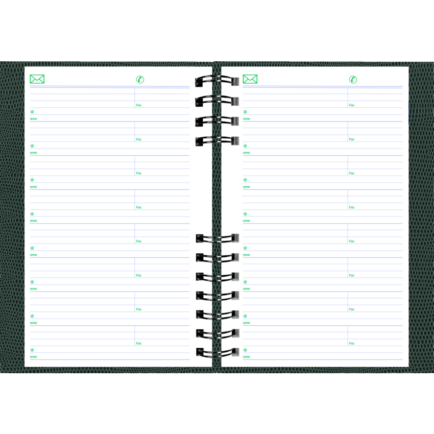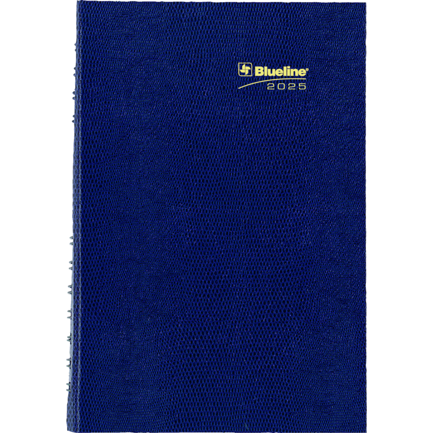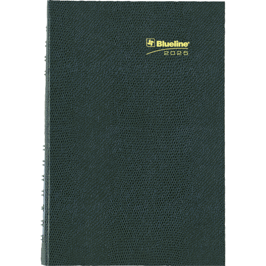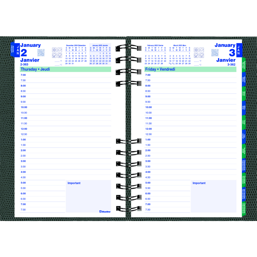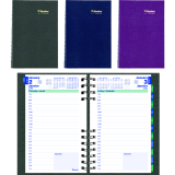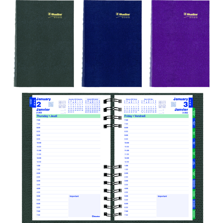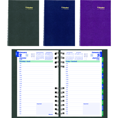 Contains a minimum of 50% post-consumer recycled material. FSC® Certified. Twin wire bound. Hard, lizard-like cover. 1 page per day. 7:00 a.m. to 7:30 p.m. in 1/2 hour intervals. Note box on each page. Monthly expense section. Self-adhesive, laminated tabs. Storage pocket. 8" x 5". Bilingual. Assorted Colours.