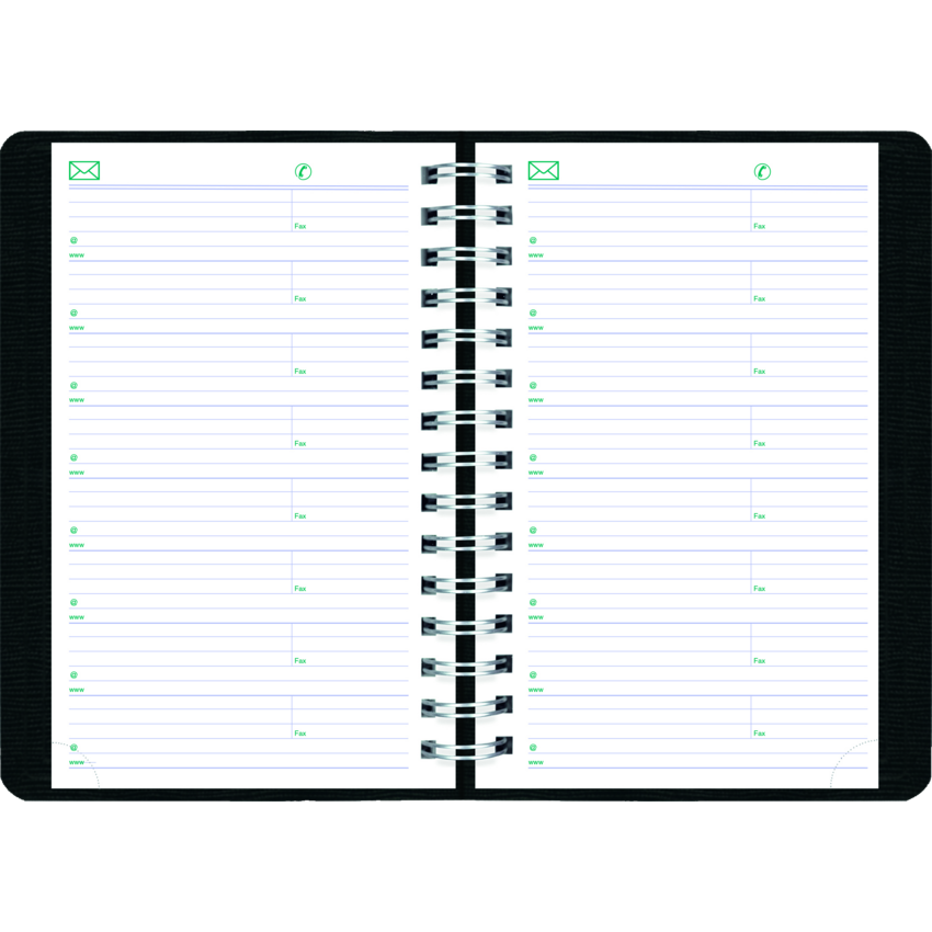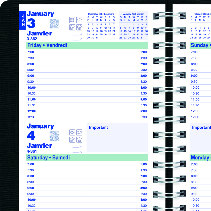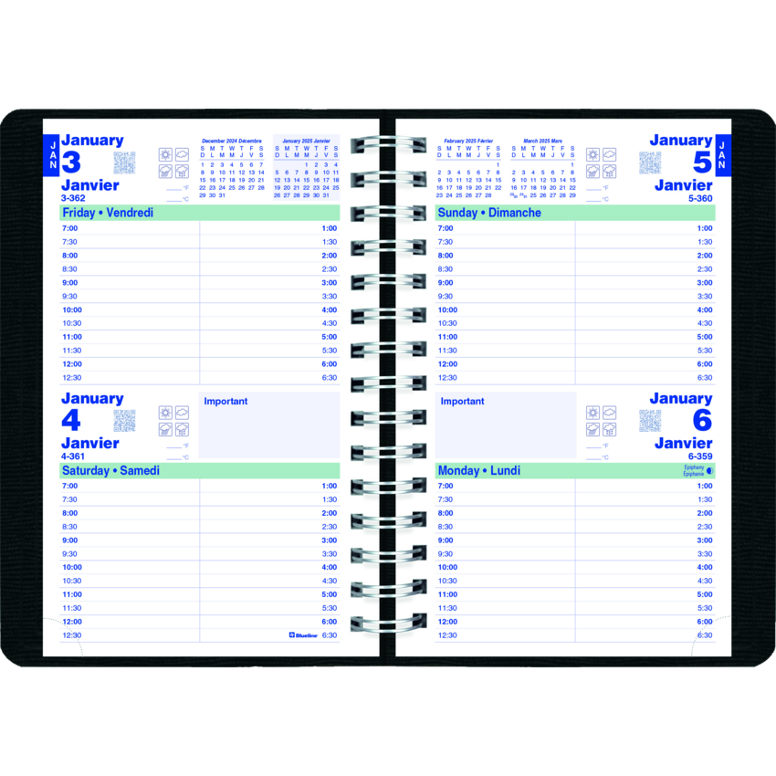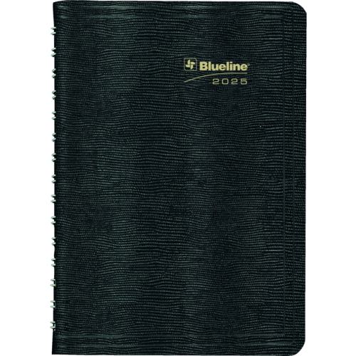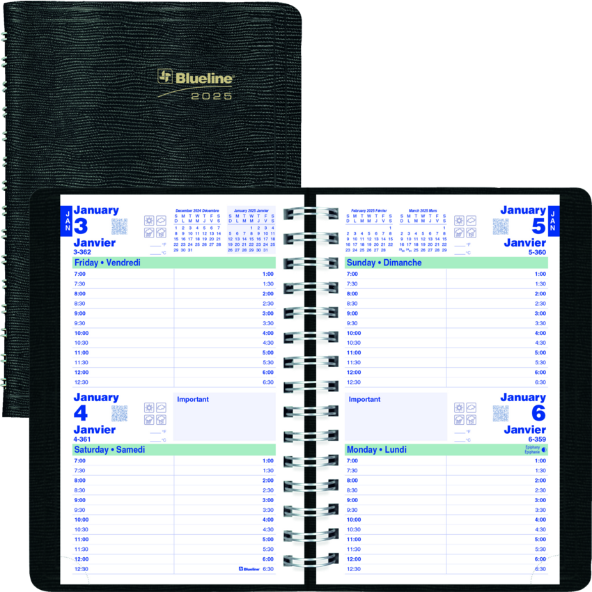 Contains a minimum of 50% post-consumer recycled material. FSC® Certified. Twin wire bound. Soft, lizard-like cover. 2 days per page. 7:00 a.m. to 6:30 p.m. in 1/2 hour intervals. Note box on each page. Telephone and address section. 8” x 5”. Bilingual. Black.