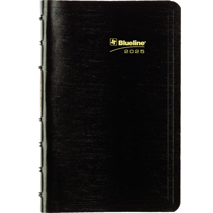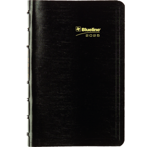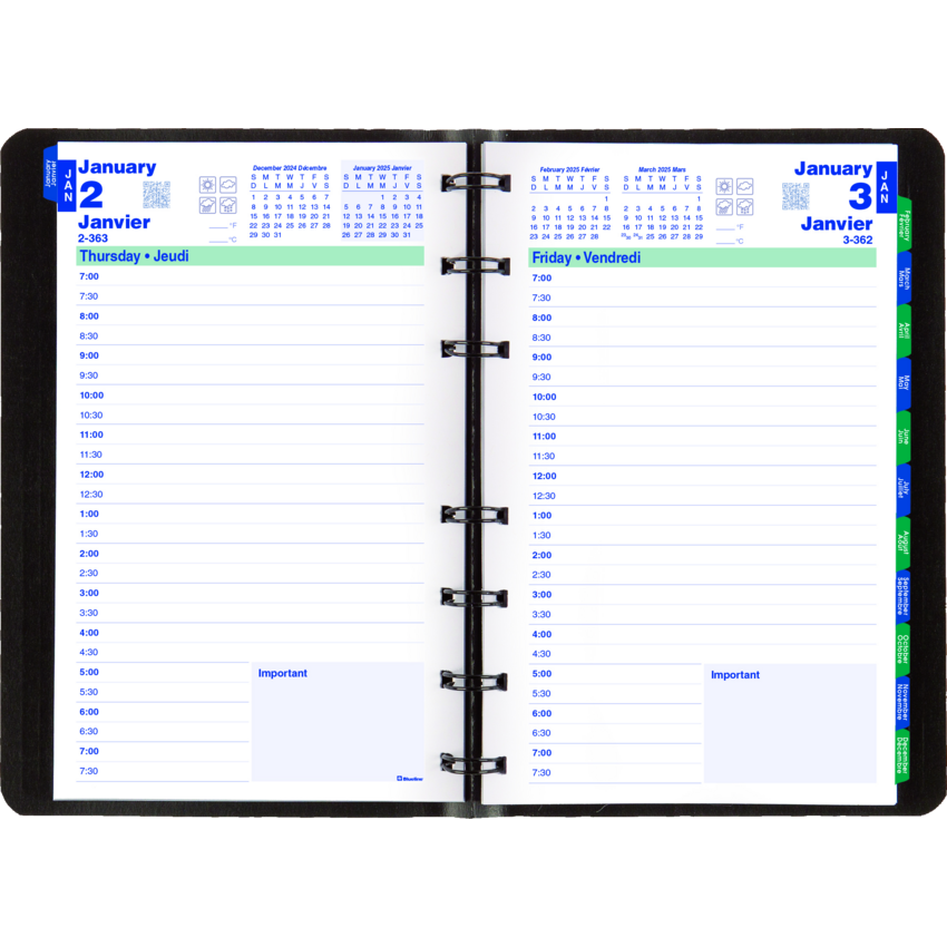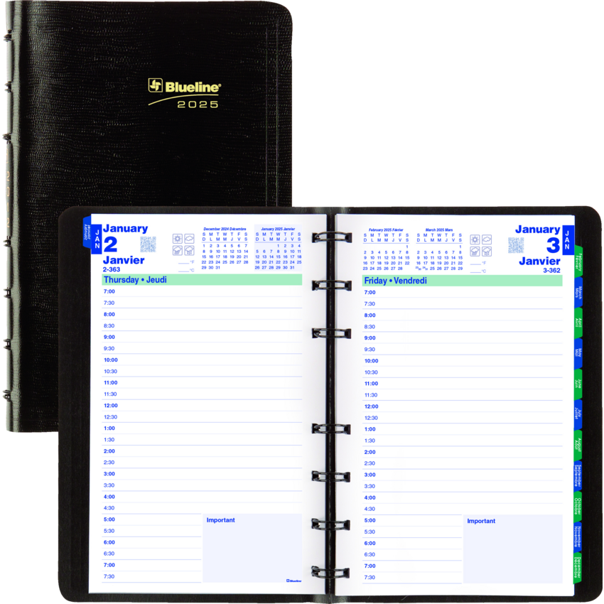 Contains a minimum of 50% post-consumer recycled material. FSC® Certified. Twin wire bound. Soft, lizard-like cover. 1 page per day. 7:00 a.m. to 7:30 p.m. in 1/2 hour intervals Saturday and Sunday on the same page. Includes 10 MiracleBind™ ruled pages tha can be removed and reiserted. Self-adhesive laminated tabs. 8" x 5". Bilingual. Black.