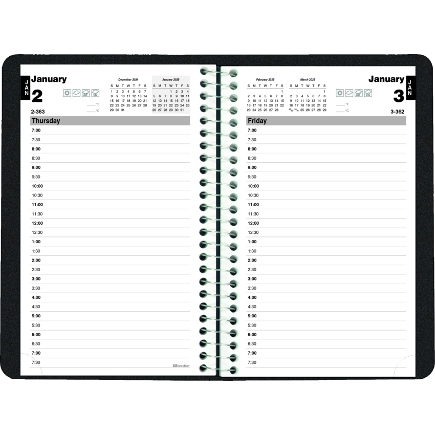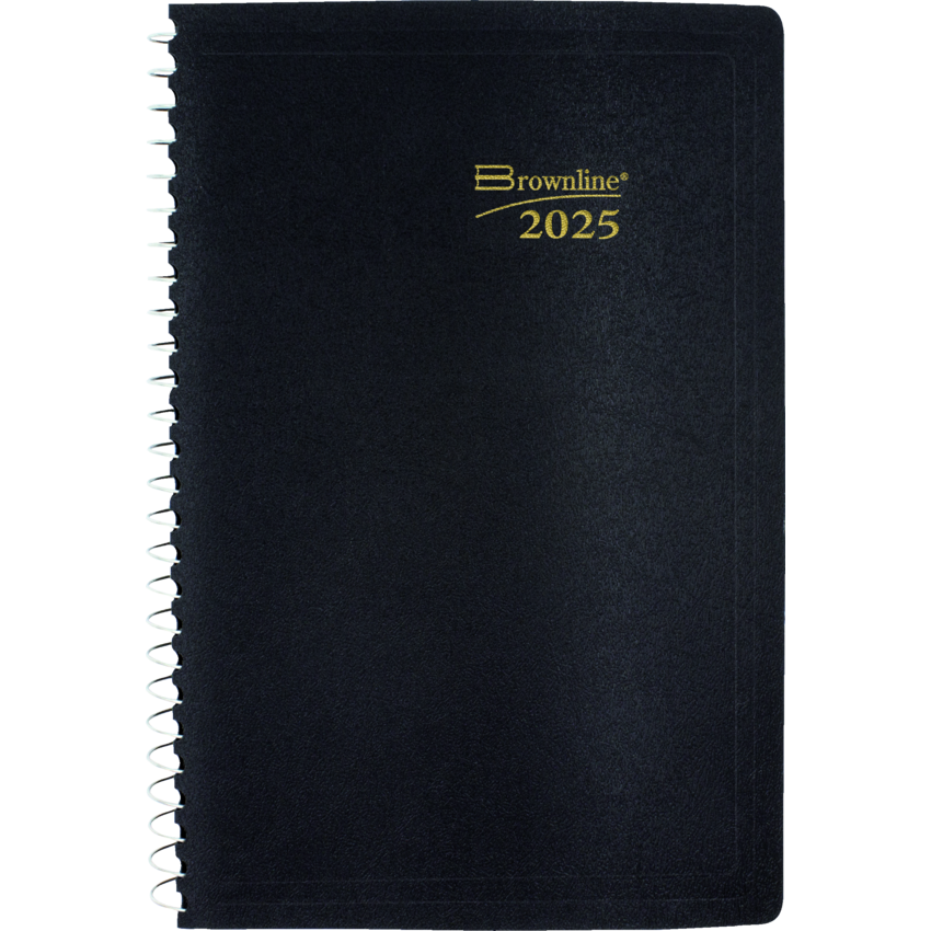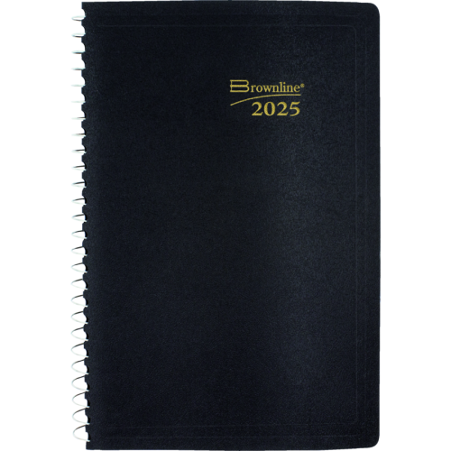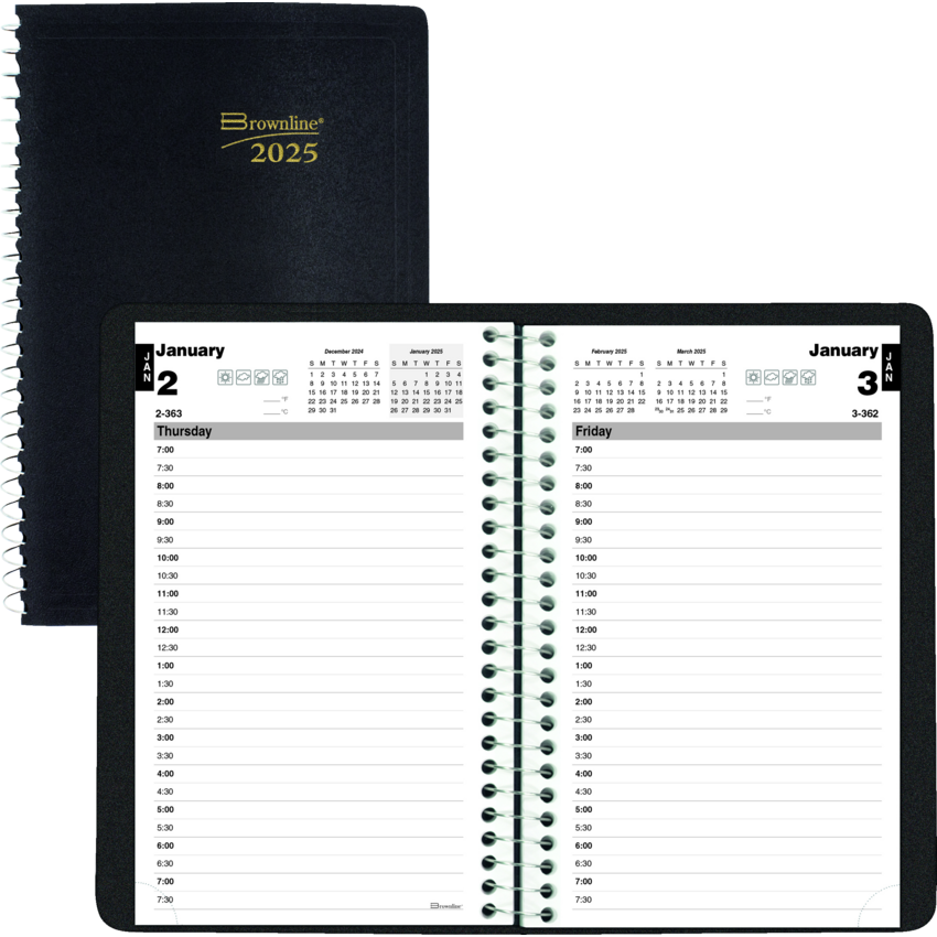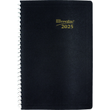 Contains a minimum of 50% post-consumer recycled content. Soft poly cover. Spiral wire binding. 1 page per day. Appointment schedule from 7:00 a.m. to 7:30 p.m. in 1/2 hour intervals. Saturday and Sunday on one page. Past, current and 2 future months reference. 8" x 5". English. Black.