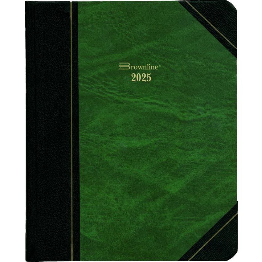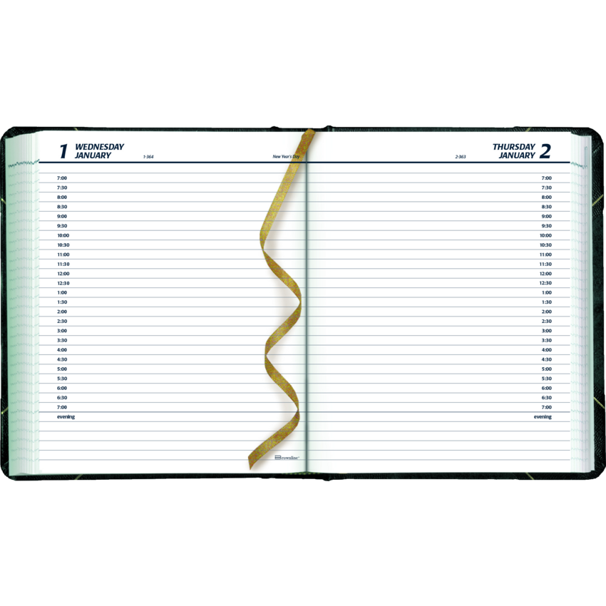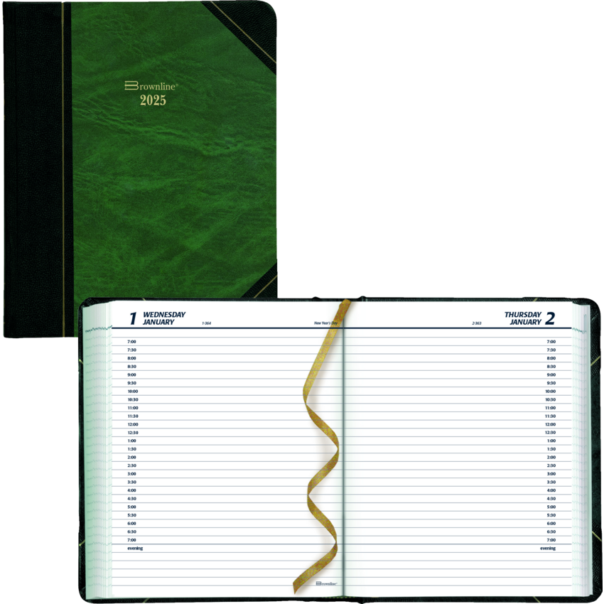 Contains a minimum of 50% post-consumer recycled material. Sewn binding. Hard, marble cover. 1 page per day. 7:00 a.m. to 7:00 p.m. in 1/2 hour intervals. Space for evening appointments. Cash record section. Includes gold ribbon bookmark and telephone/address section. 8-1/8" x 6-9/16". English. Green with Black spine.