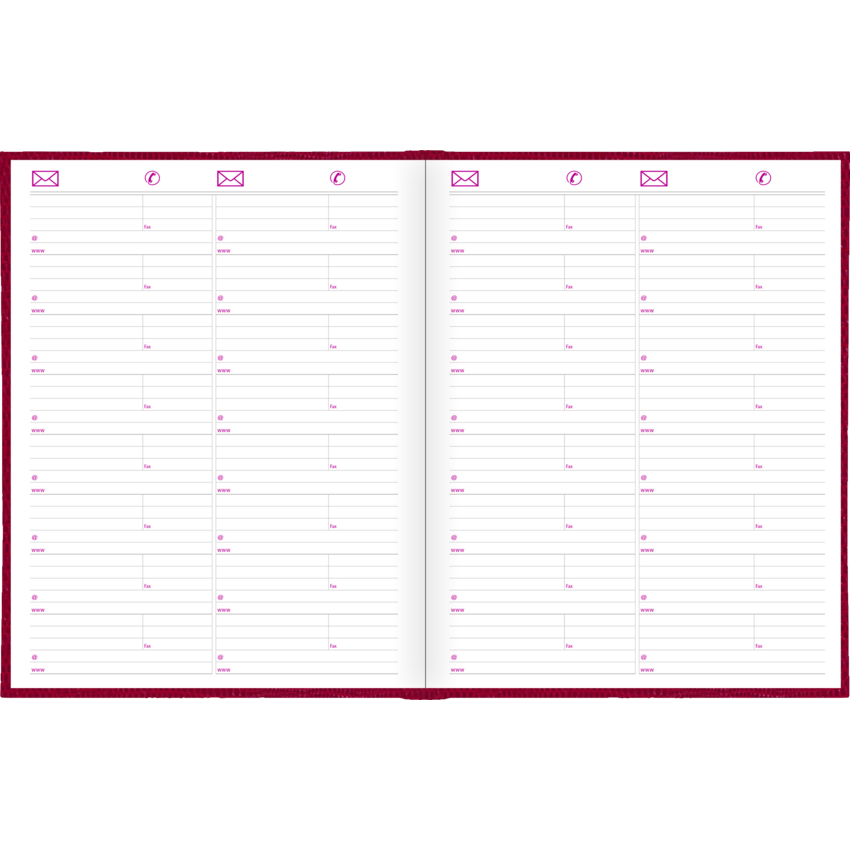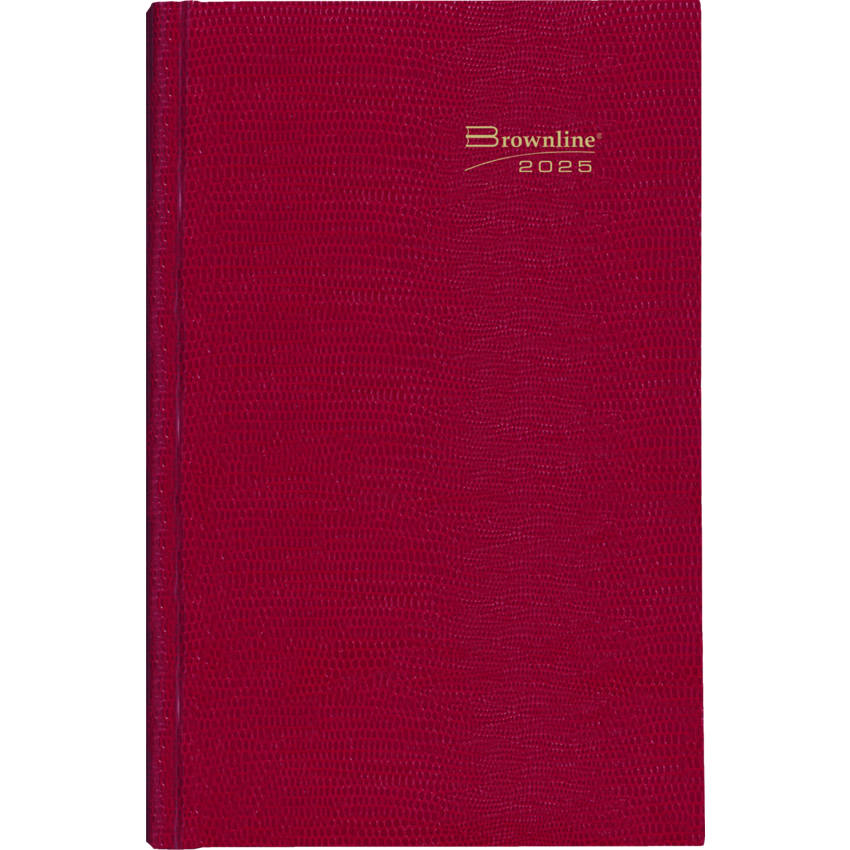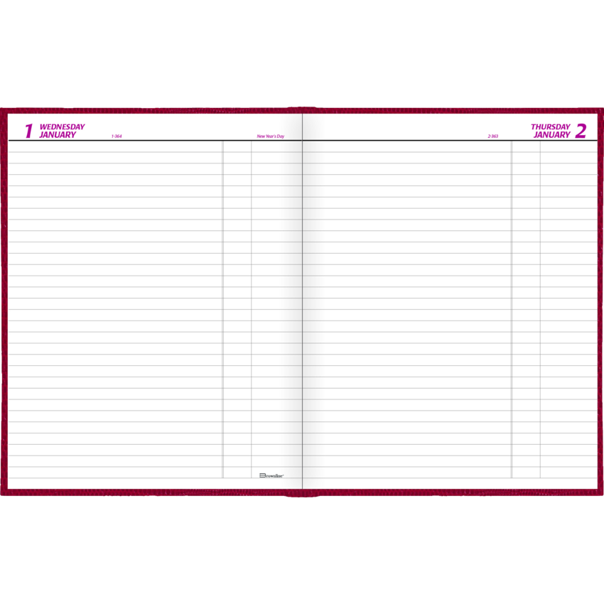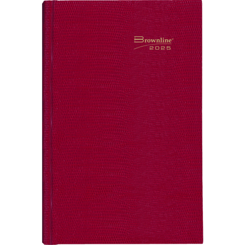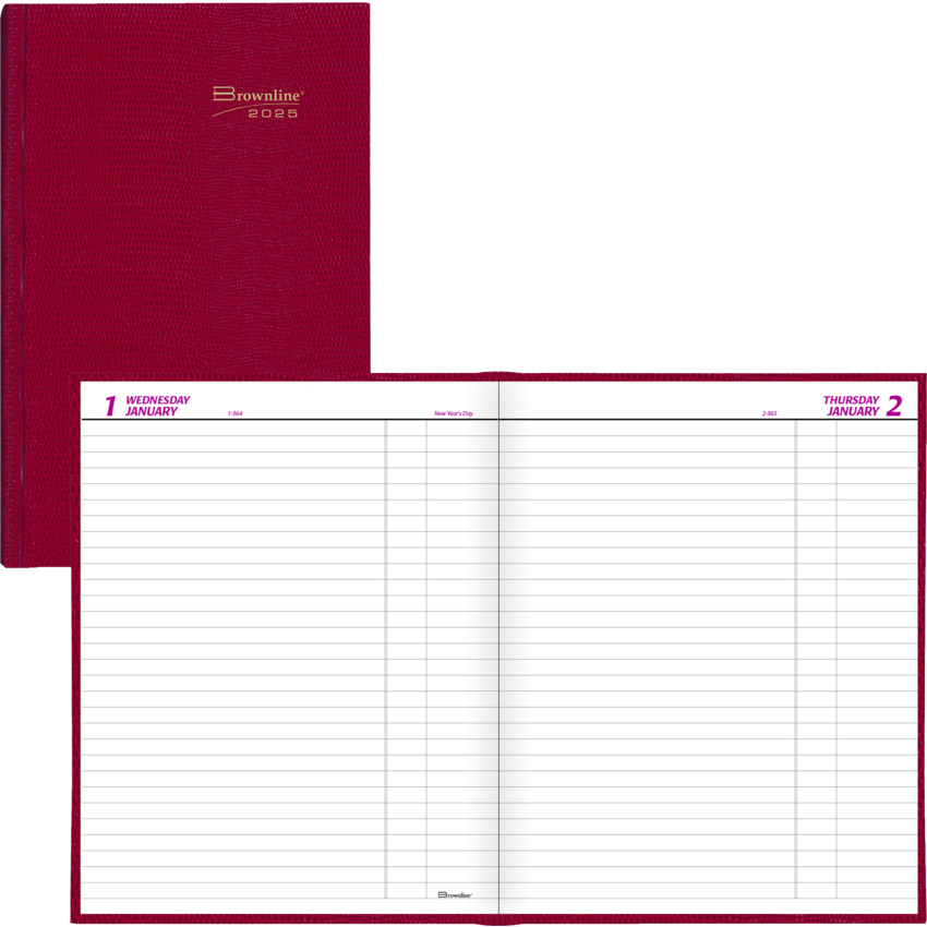 Contains a minimum of 50% post-consumer recycled content. FSC® Certified. Perfect bound. Hard, lizard-like cover. 1 page per day. Cash record section. Current and perpetual calendars. Large, feint-ruled areas for entries. 10" x 7-7/8". Red. English.
