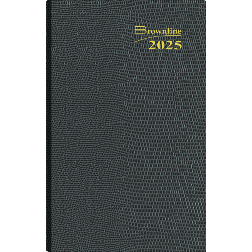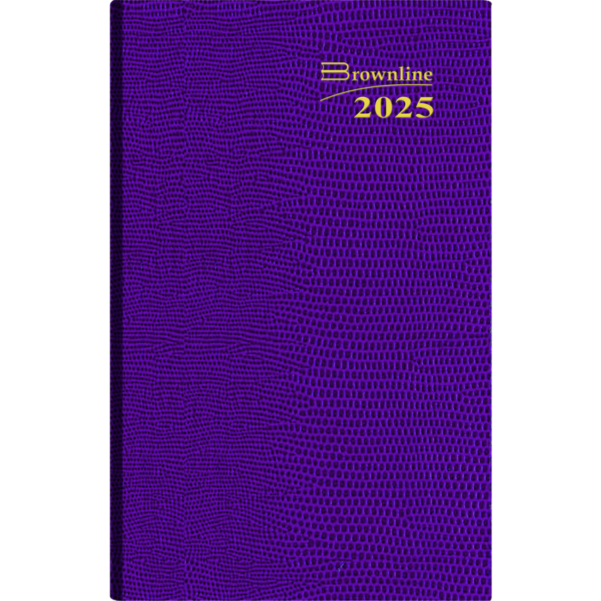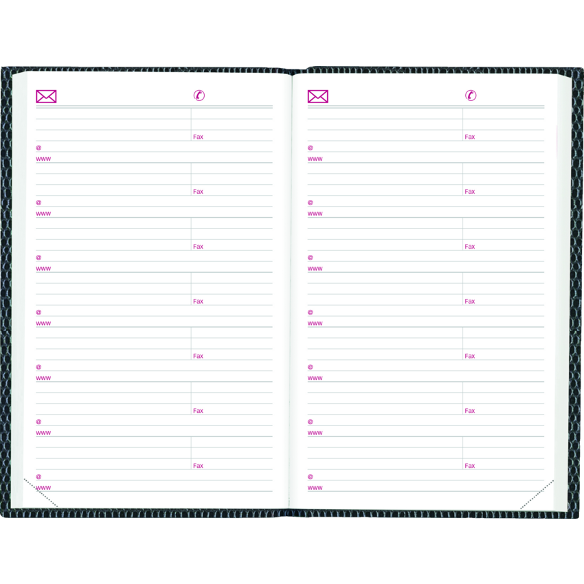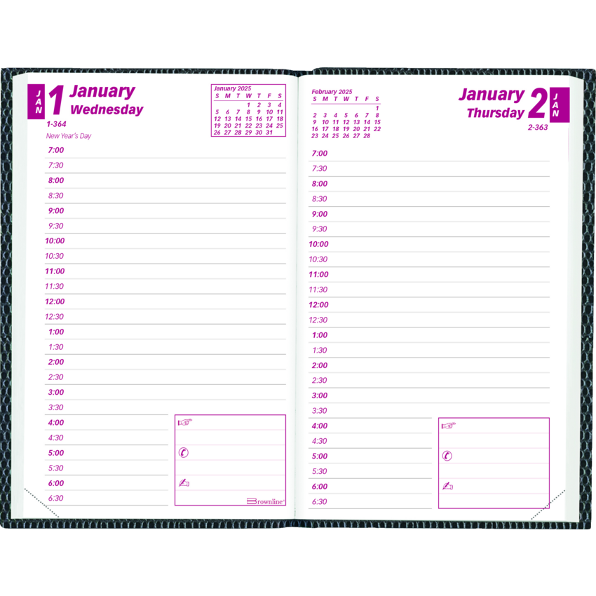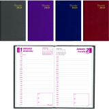 Contains a minimum of 50% post-consumer recycled material. FSC® Certified. Perfect bound. Flexible, lizard-like cover. 1 page per day. 7:00 a.m. to 6:30 p.m. in 1/2 hour intervals. Cash account section Telephone and address section Note box on each page. 4-3/4" x 3". English. Assorted Colours.
