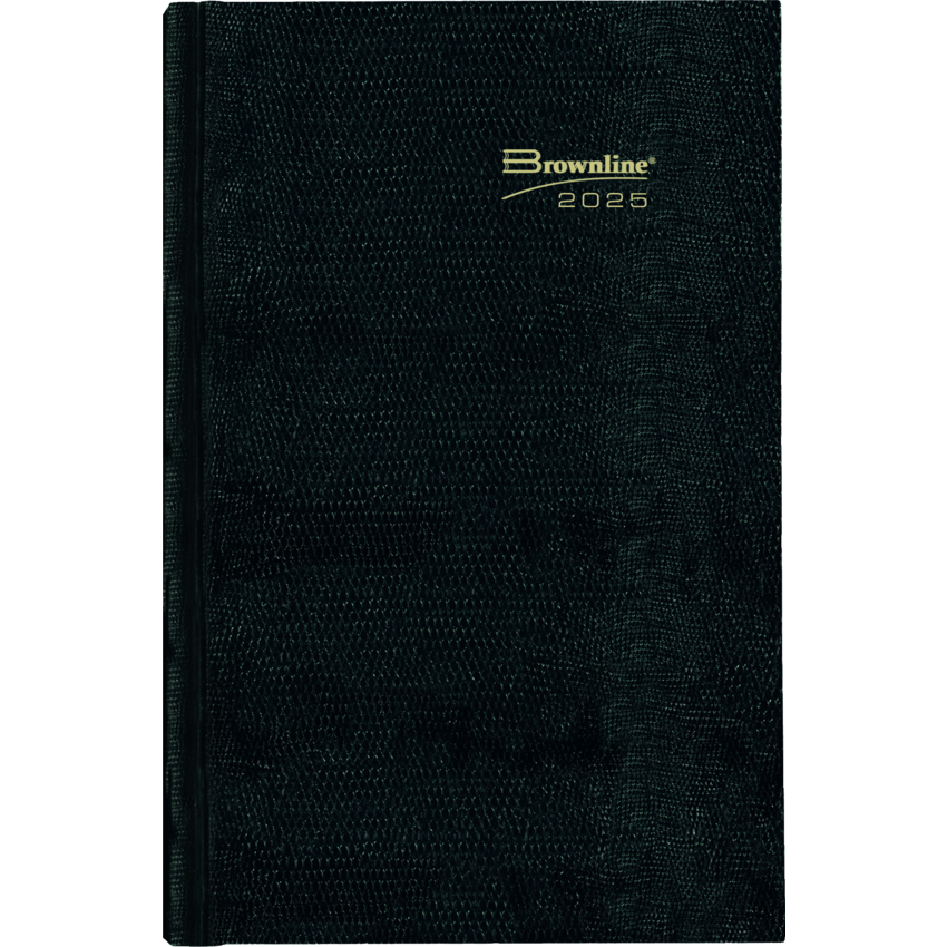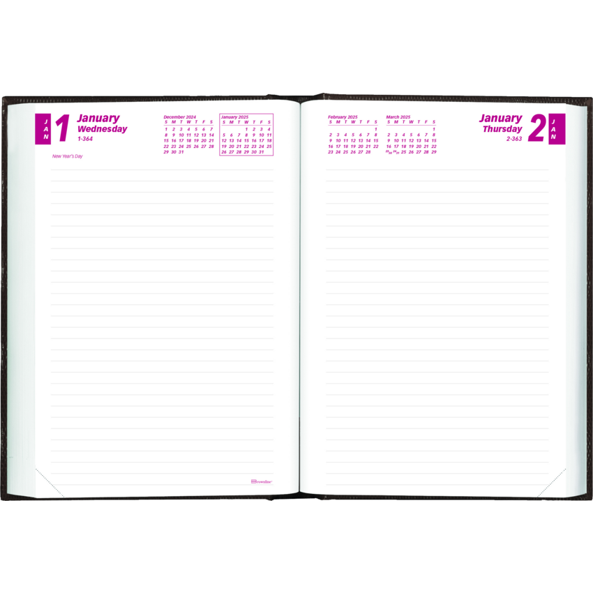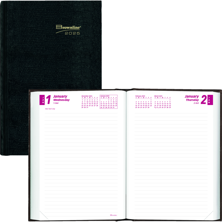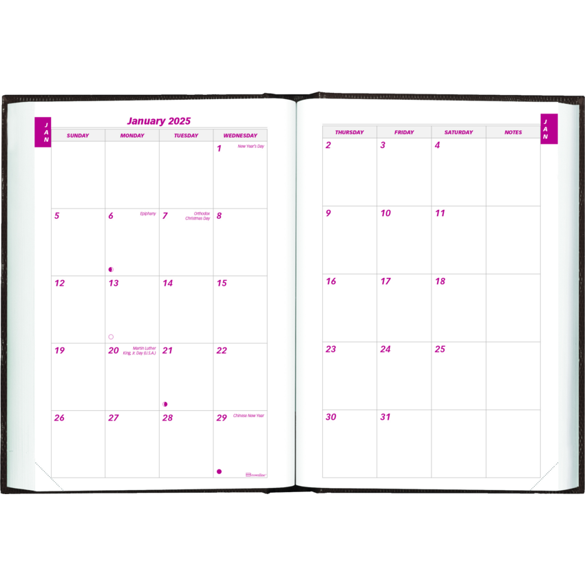 Hard cover, perfect bound untimed daily planner is feint ruled for entries. Includes calendars for preceding, current and two following months on each spread. Offers a monthly planner before each month. Each page has three blocks for reminder notes and calls. Appointment book planner includes countdown of days passed and to come and holidays. Contains post-consumer recycled material. FSC Certified. English.