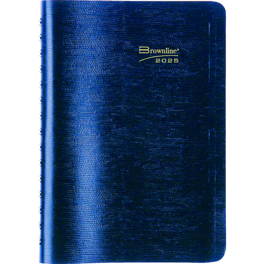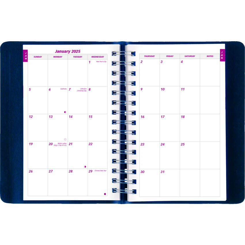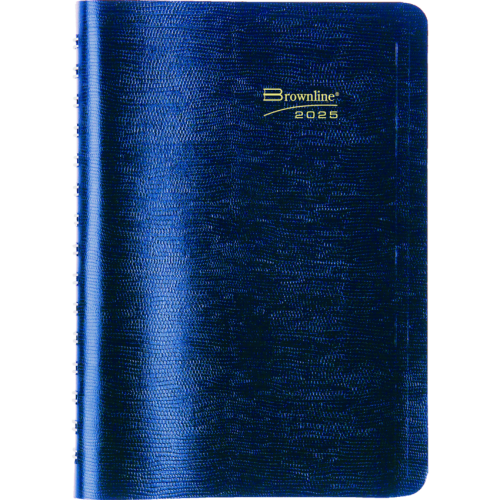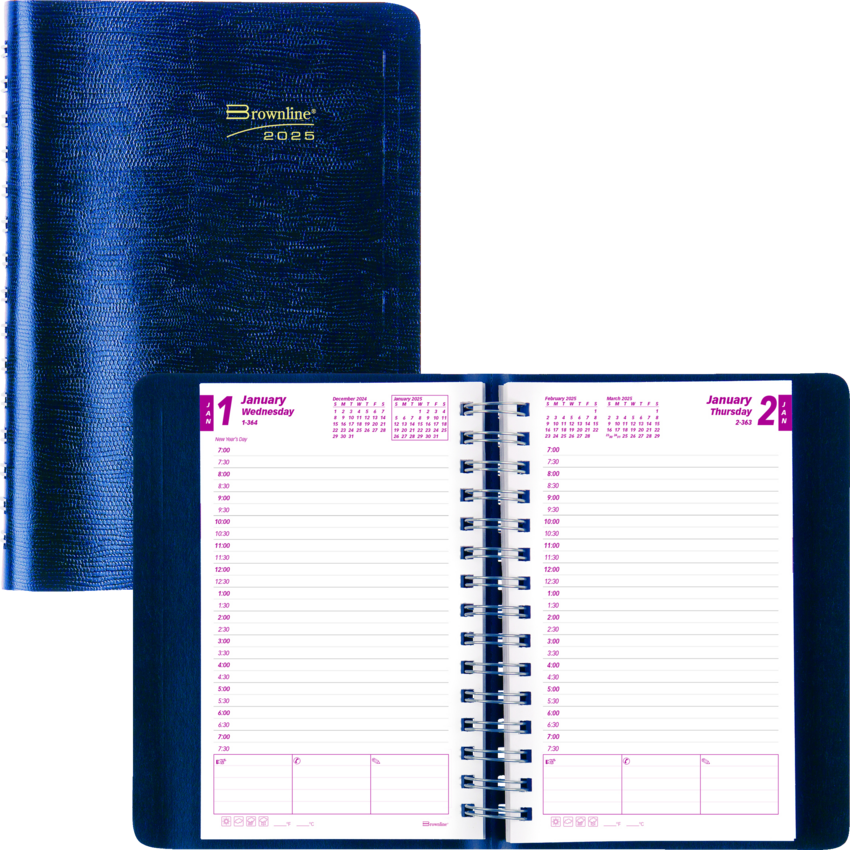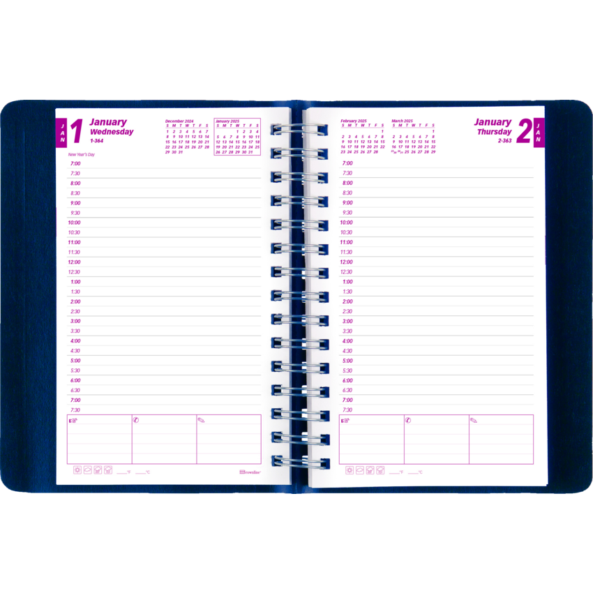 Contains a minimum of 50% post-consumer recycled material. FSC® Certified. Twin wire bound. Soft, lizard-like cover. 1 page per day. 7:00 a.m. to 7:30 p.m. in 1/2 hour intervals. Monthly planner before each month. 3 blocks for reminder notes and calls. Blue.