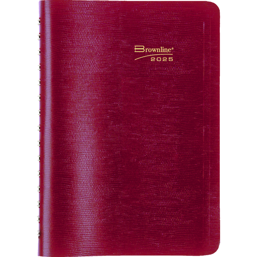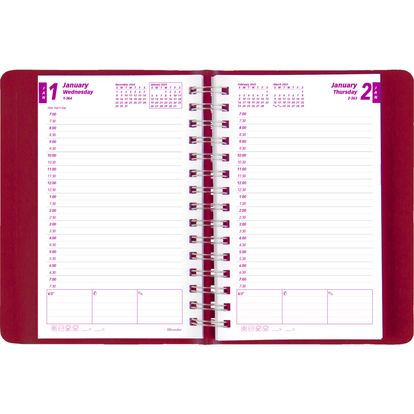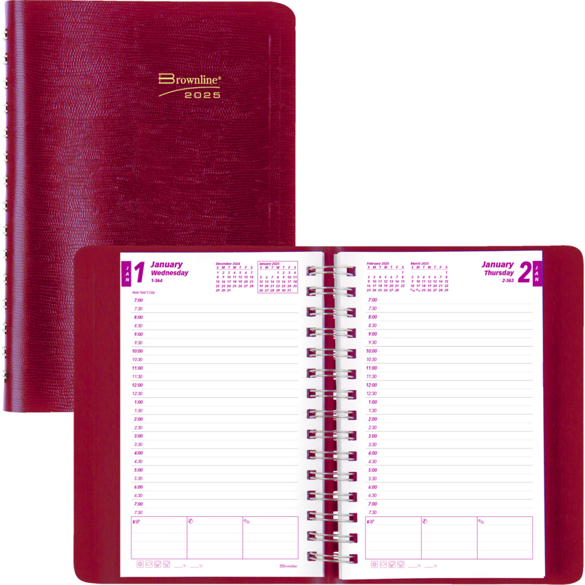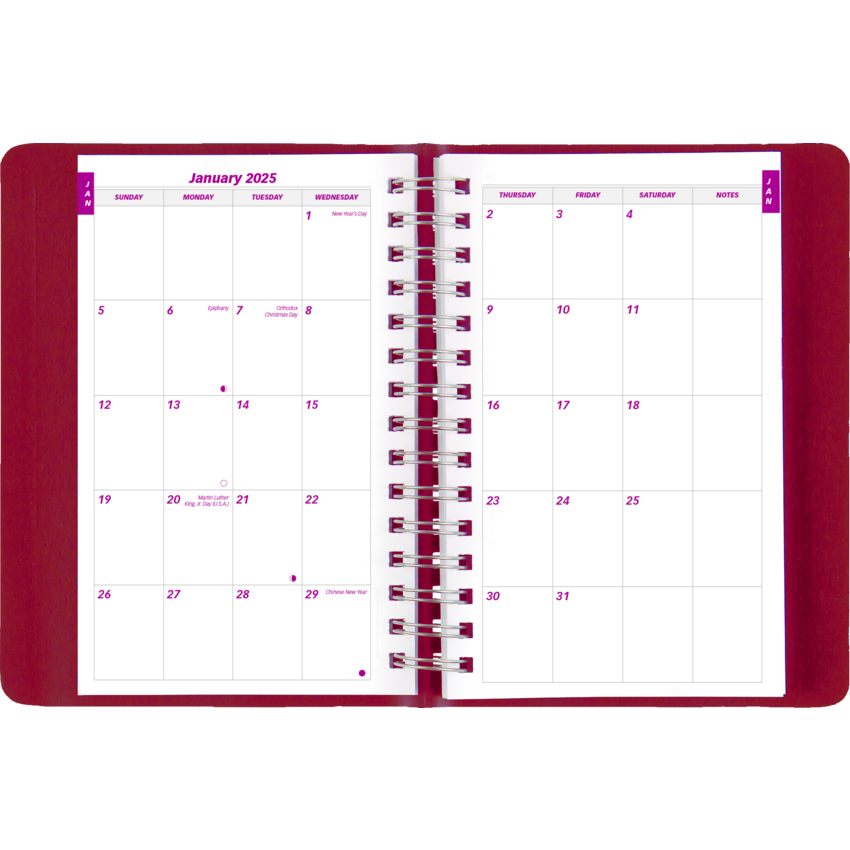 Contains a minimum of 50% post-consumer recycled material. FSC® Certified. Twin wire bound. Soft, lizard-like cover. 1 page per day. 7:00 a.m. to 7:30 p.m. in 1/2 hour intervals. Monthly planner before each month. 3 blocks for reminder notes and calls. Red.
