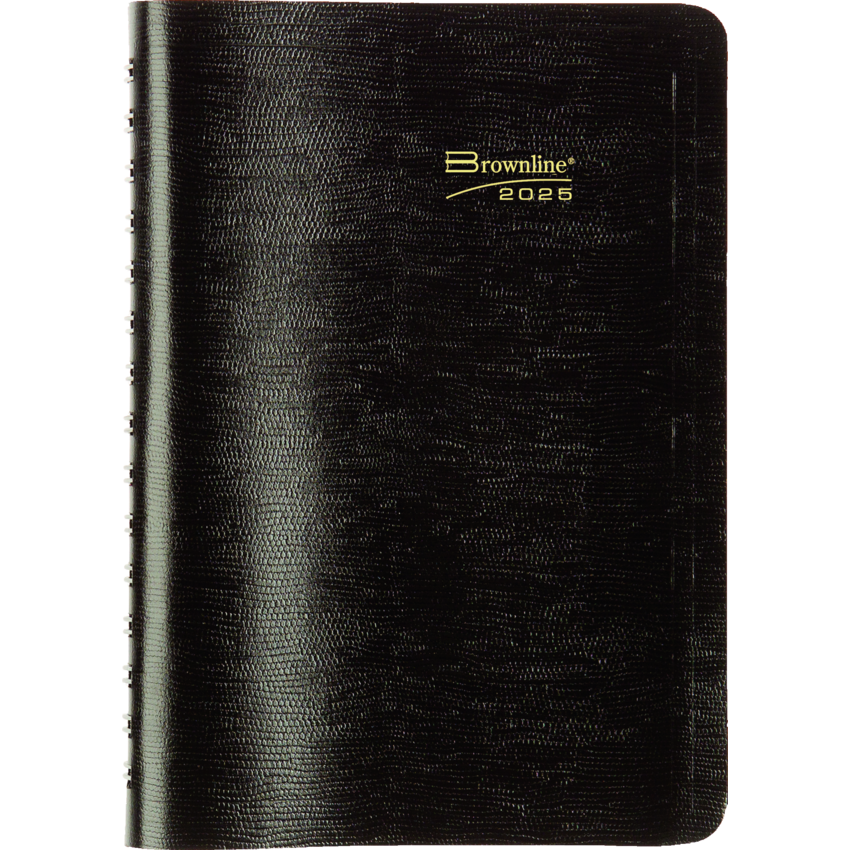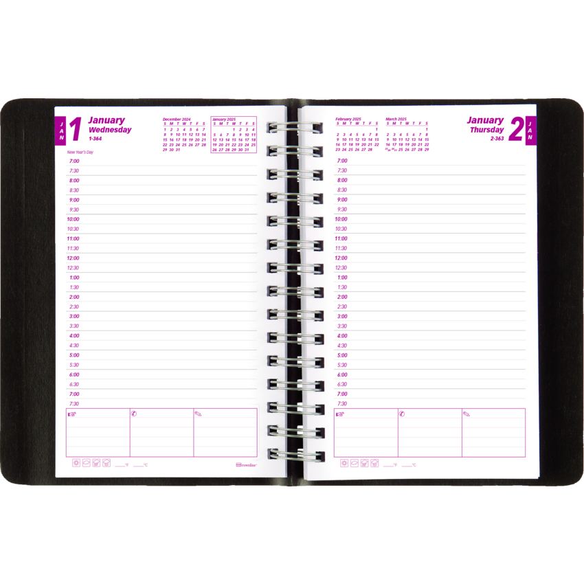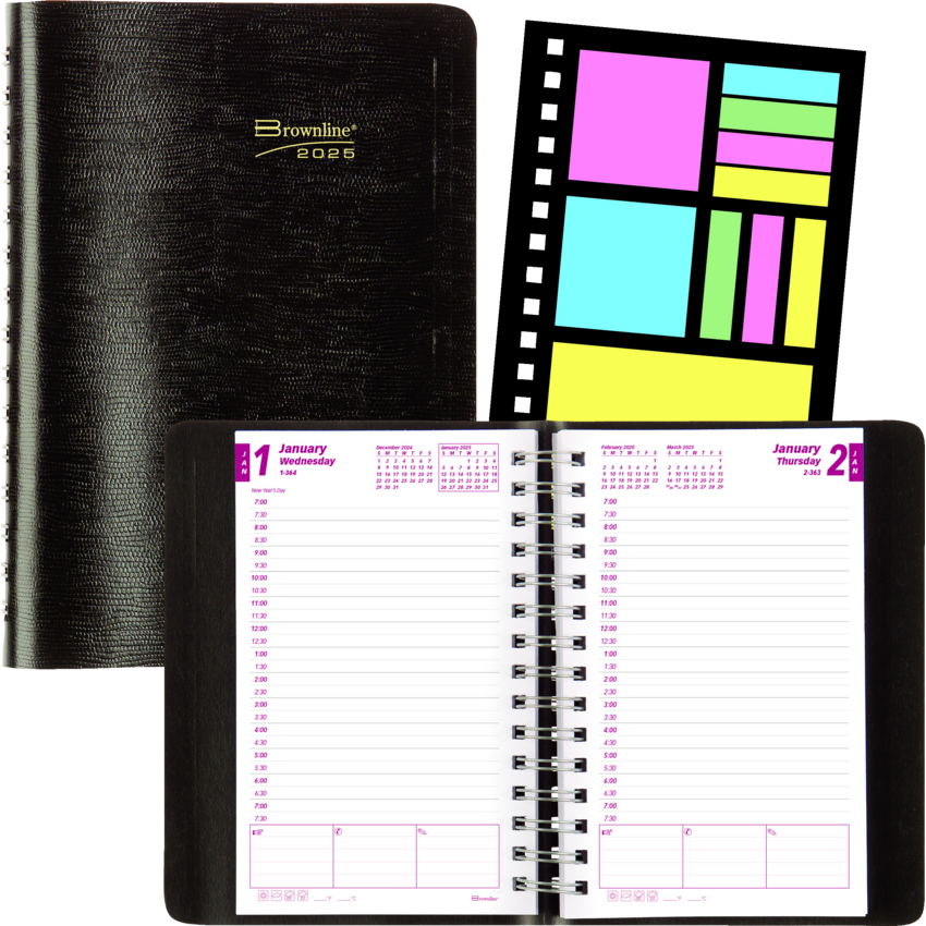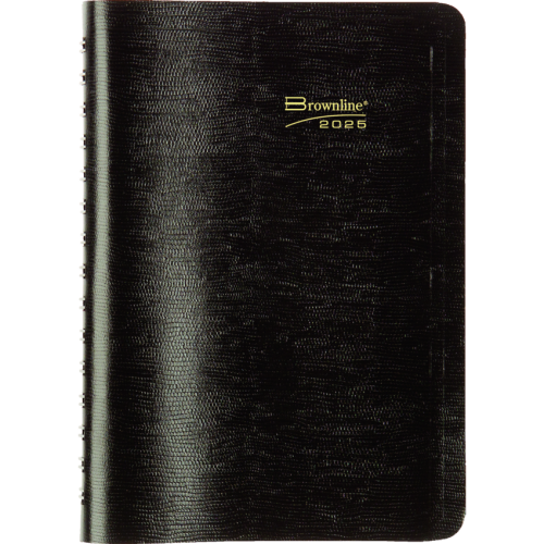 50% post-consumer recycled material. FSC® Certified. Twin wire bound. Soft, lizard-like cover. 1 page per day. Appointment schedule from 7:00 a.m. to 7:30 p.m. in 1/2 hour intervals, for full week. Monthly planner before each month. Each page has 3 block for reminder notes and calls. Includes a custom self-stick book. Black.