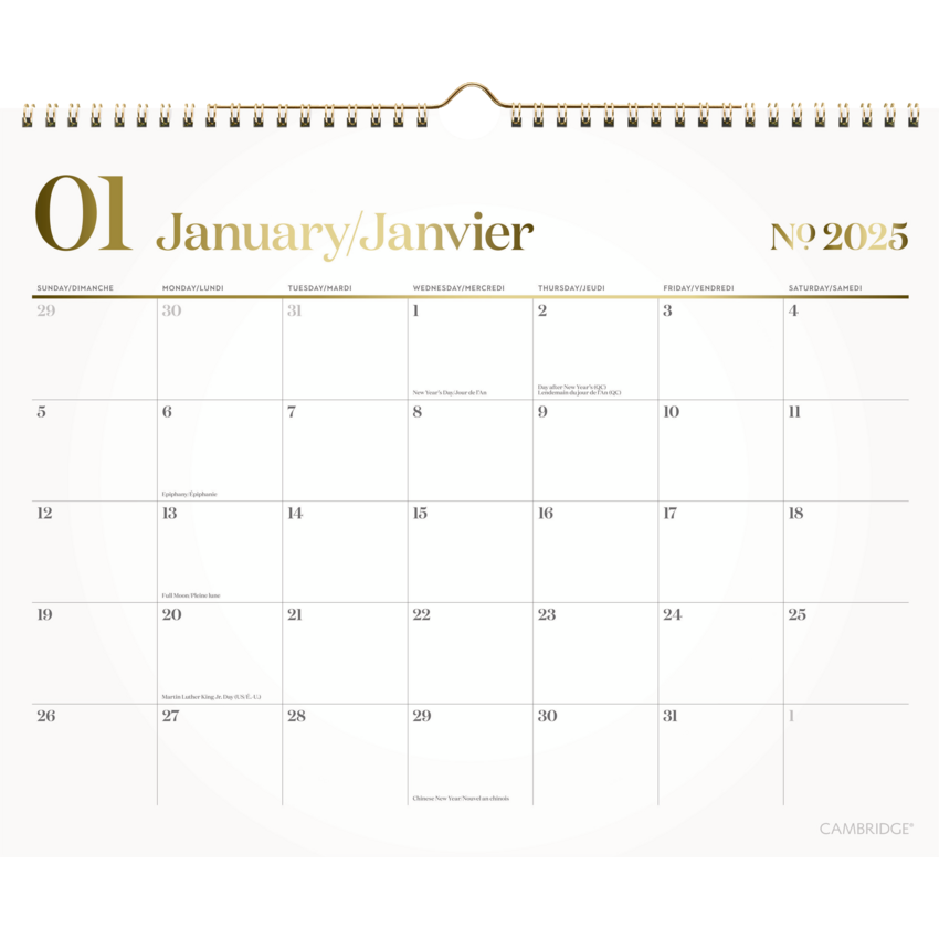 12 months, January-December. 1 month per page. Gold twin wire bound at top. Features unruled daily blocks for plenty of open planning space. Weeks run Sunday-Saturday and holidays are listed. Built-in hanging loop for easy wall display. 15” x 12”. Bilingual. White/Grey.