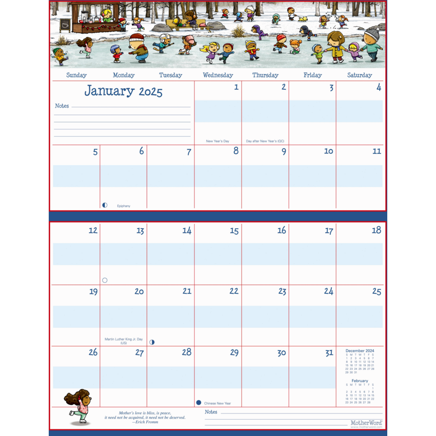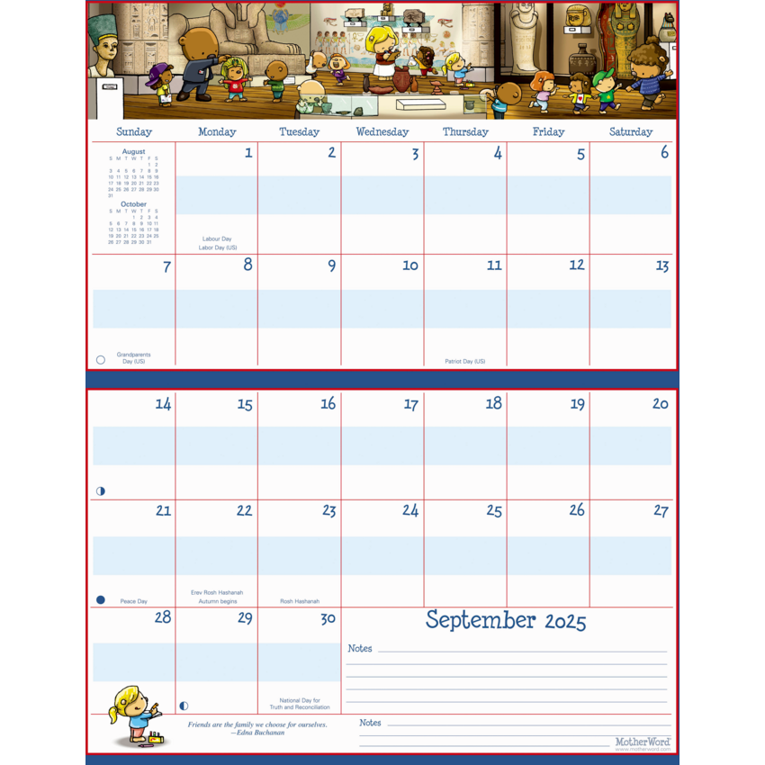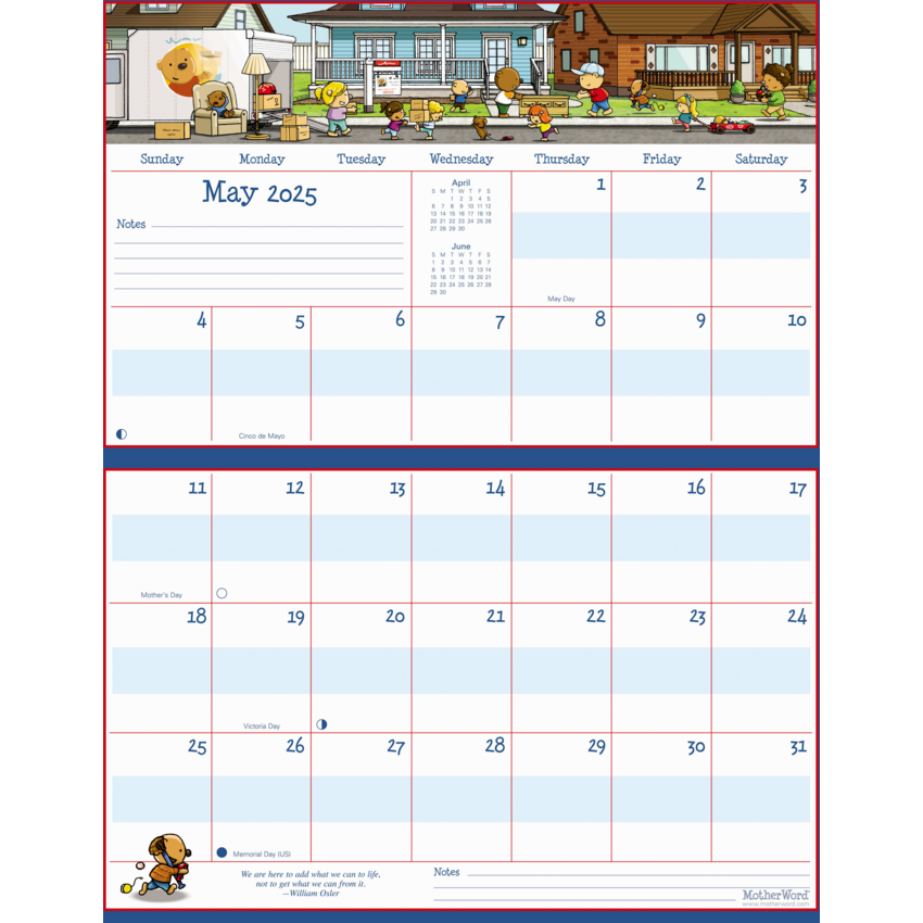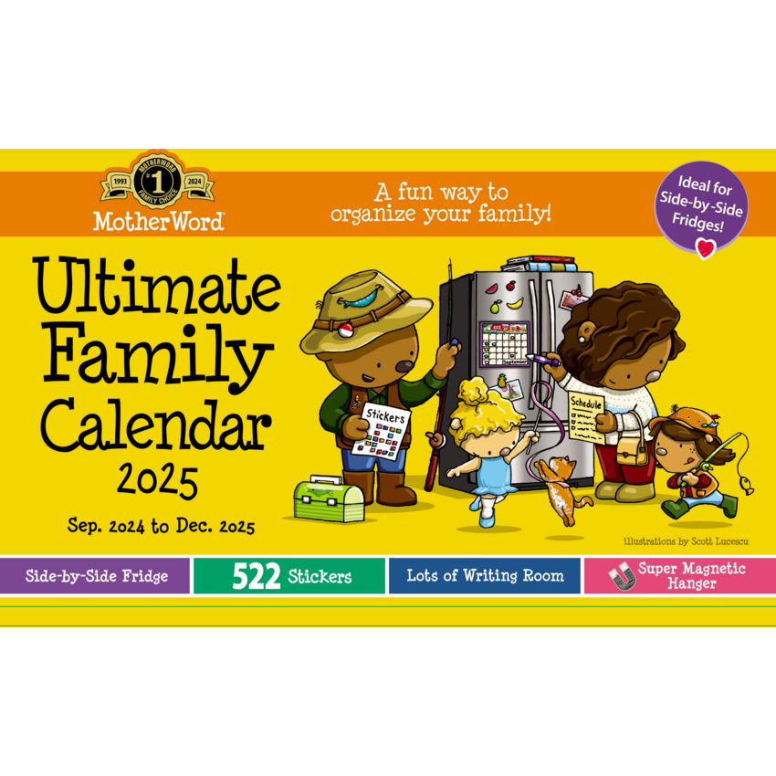 Calendars designed for busy families with lots of writing room. Can be used as a fridge, desk or wall calendar 1 month per spread. 16 months, September to December. Past and future month reference. Cartoon illustration on each full colour page with a funny quote. Notes section on each month. Includes reminder stickers that can be placed on special days for appointments, birthdays, etc. 15" x 9-1/2". English.