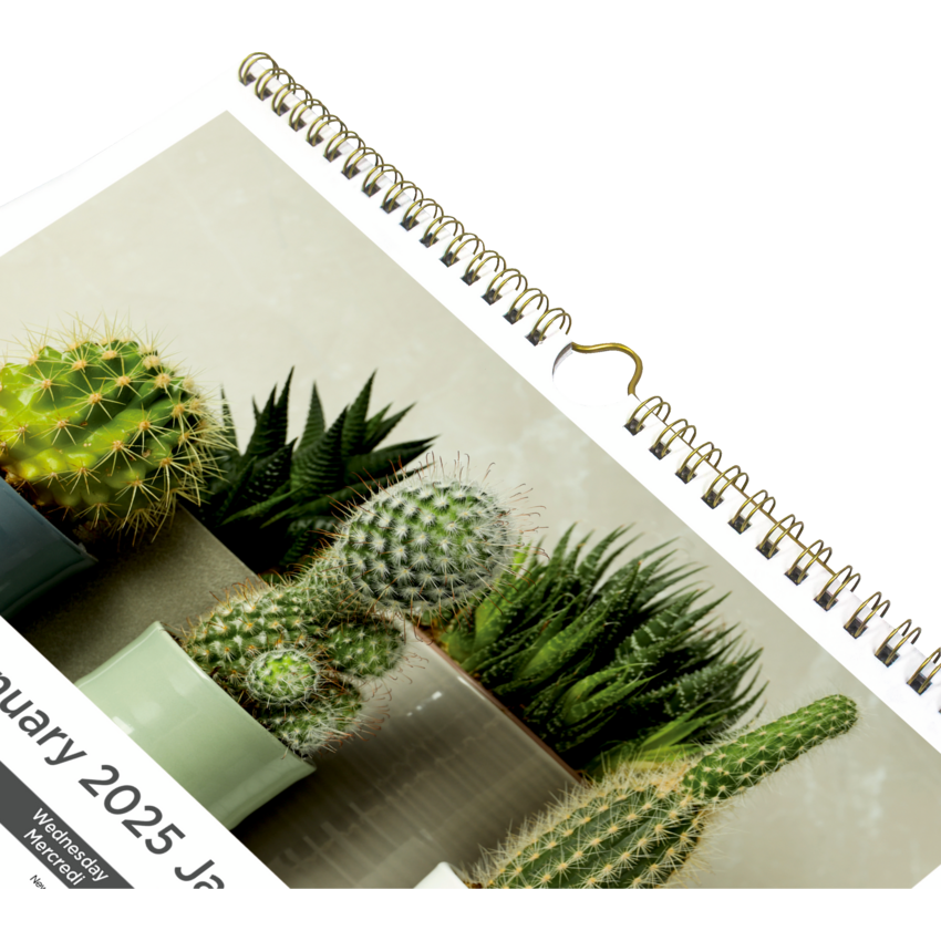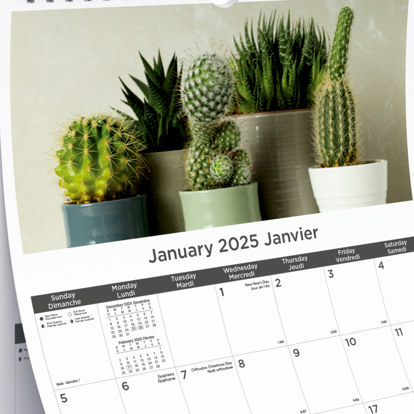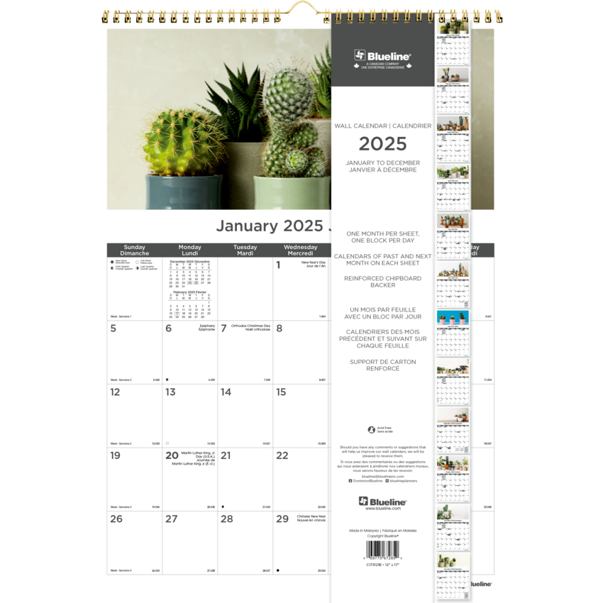 Contains a minimum of 50% post-consumer recycled material. Different design each month, past and following month on each sheet. Reinforced chipboard backer. Gold twin-wire bound with eyelet to suspend. January to December. 1 month per sheet, 1 block per day. 12" x 17". Bilingual.