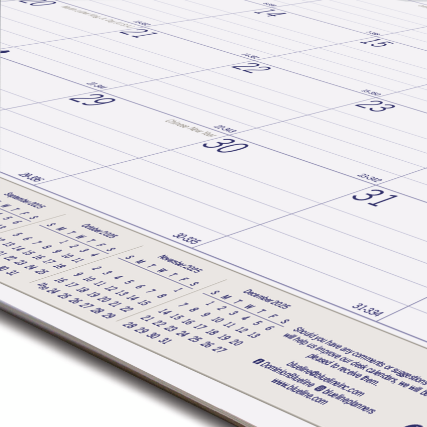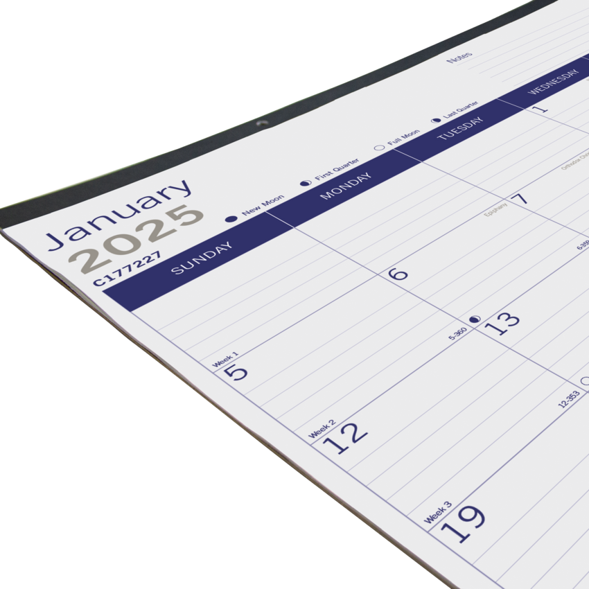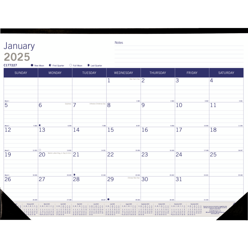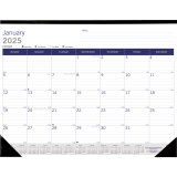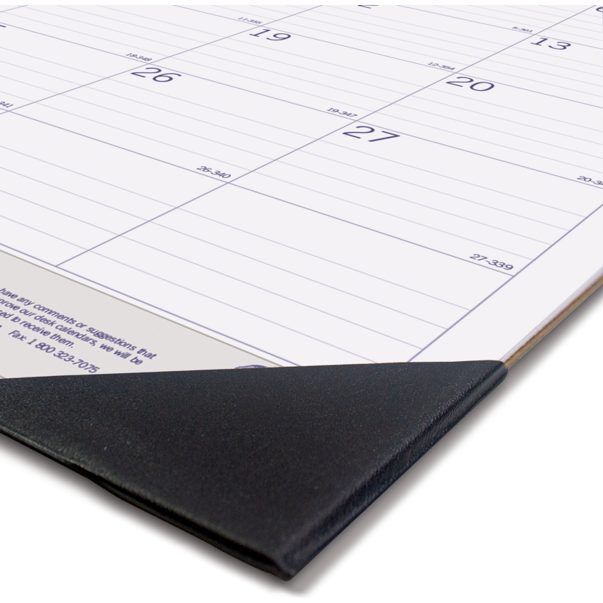 Monthly desk pad offers ample planning space and eco-friendly, renewable materials. FSC certified bagasse paper is made mostly from sugarcane and eucalyptus. Dated planning pages range 12 months from January to December. One-month-per-page format includes ruled daily blocks, Sunday-through-Saturday scheduling, moon phases, unruled space for notes and a yearly calendar at the top of each sheet. Current reference month is shaded for easy identification. Nonrefillable pad also features a reinforced chipboard backer and two corners.