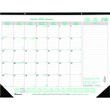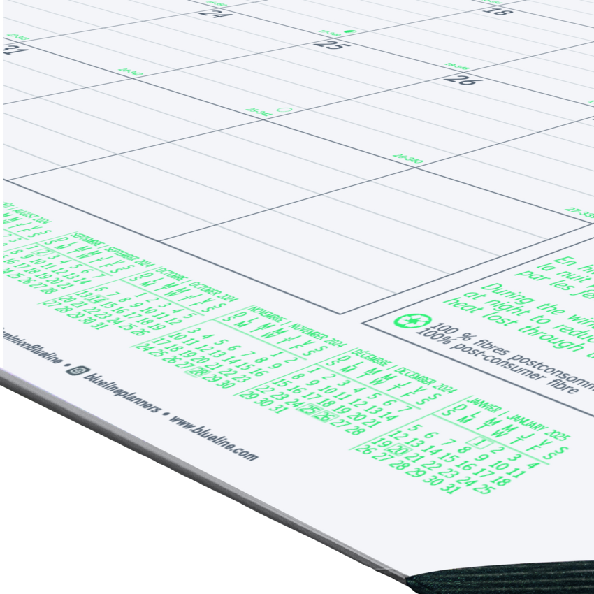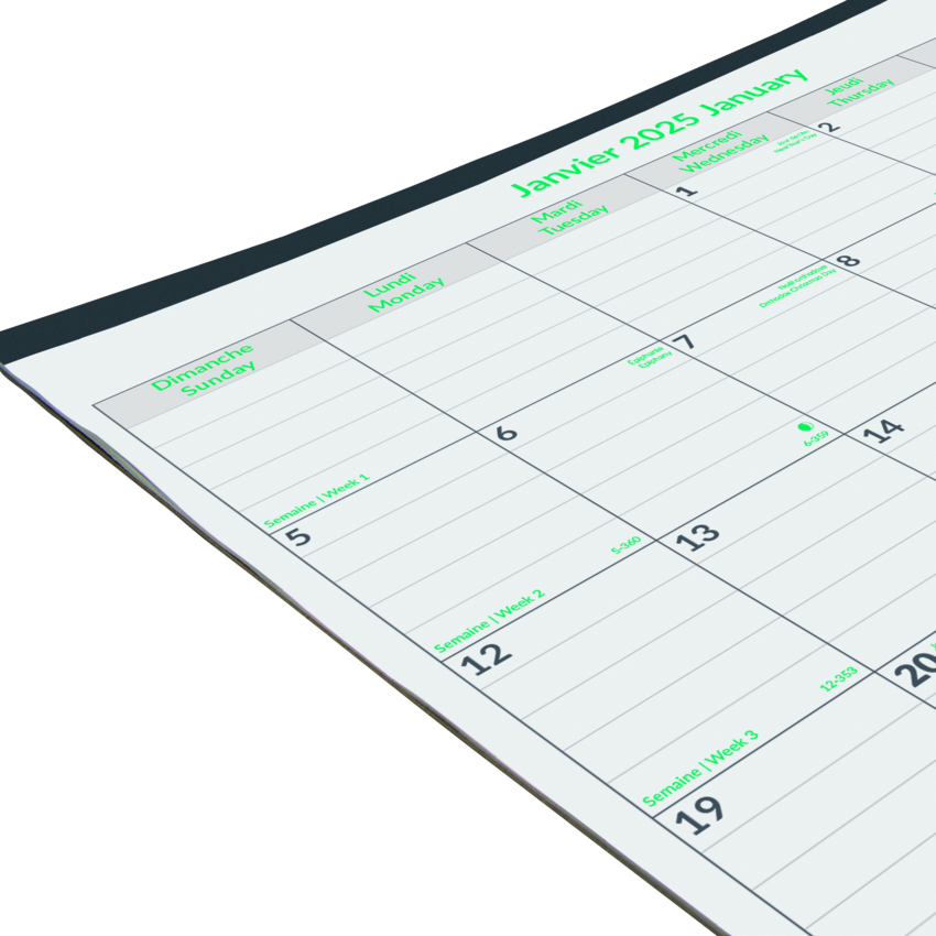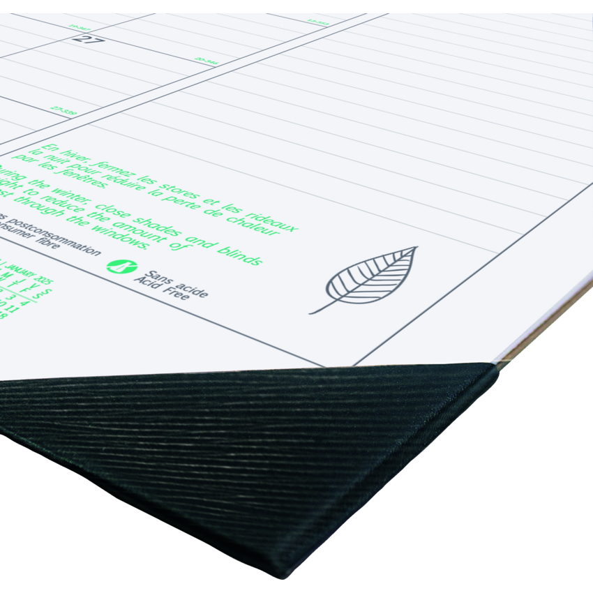 100% post-consumer recycled paper. FSC Certified. 1 month per sheet. Tear-off sheets bound at top. Yearly calendar at the bottom of each sheet. Ecological tips. Reinforced chipboard backer. 22" x 17". Bilingual.
