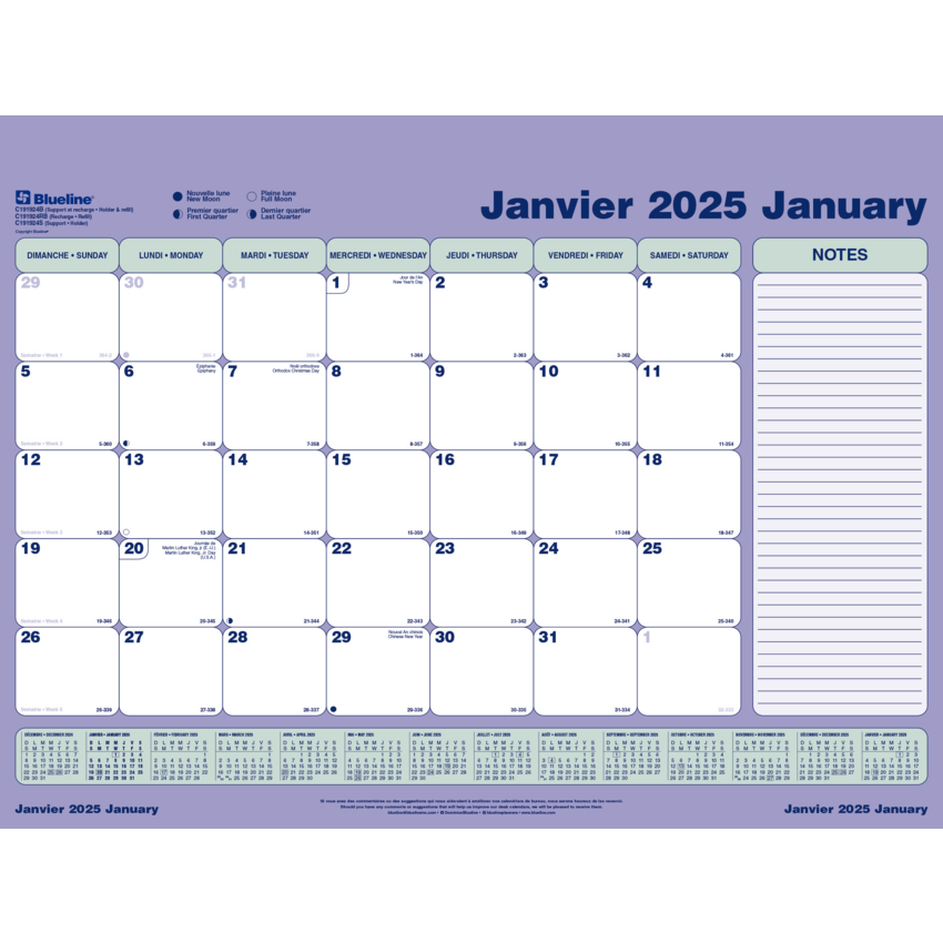Refill. 1 page per month. Features full-year calendar at bottom. 23-1/2" x 18-1/4". Bilingual.