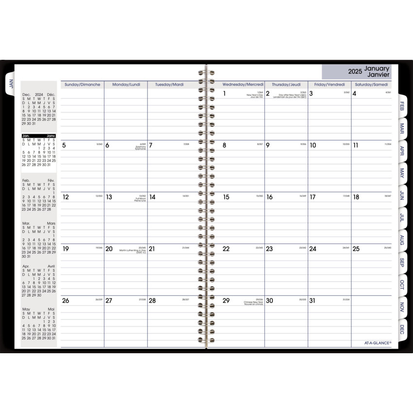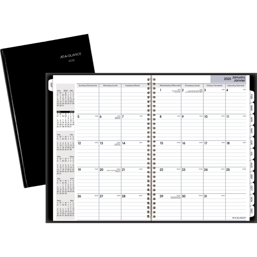 Hard cover 14-month planner offers December of one year through January of the next year one-month-per-two-page-spread planning, Planner provides one ruled block per day with past, current and four future months reference on each spread. Includes a hard cover with wire binding so pages lie perfectly flat. Bilingual planner is printed on quality paper that contains post-consumer recycled material.