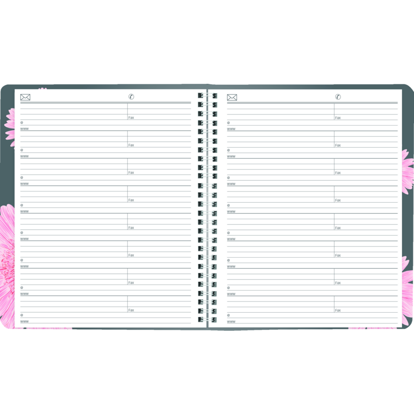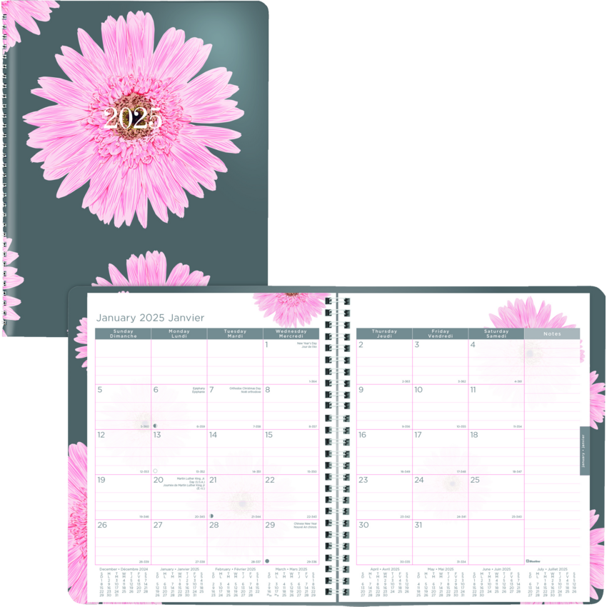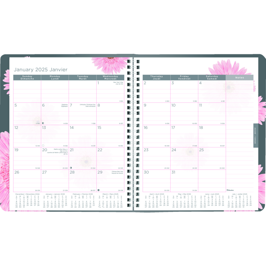 Blueline has proudly contributed over a million dollars to the breast cancer cause since 2007 from the sale of the Pink Ribbon products. Your purchase will help us surpass our goal of $25,000 this year. Contains a minimum of 50% post-consumer recycled paper. FSC® Certified. Twin wire bound. Soft, printed cover. 1 month per 2-page spread. 14-month planner, December to January. Different flower image each month. 8-7/8" x 7-1/8". Bilingual. Pink.