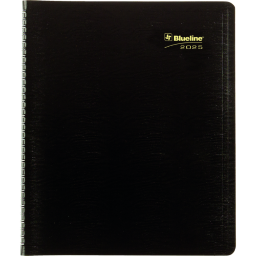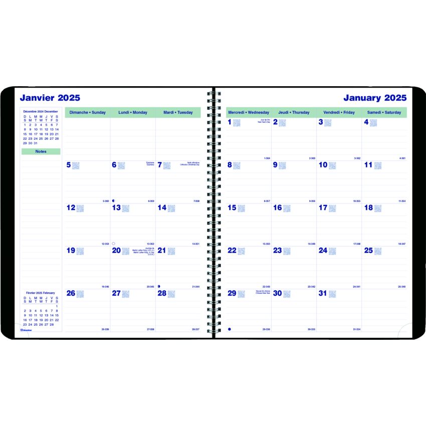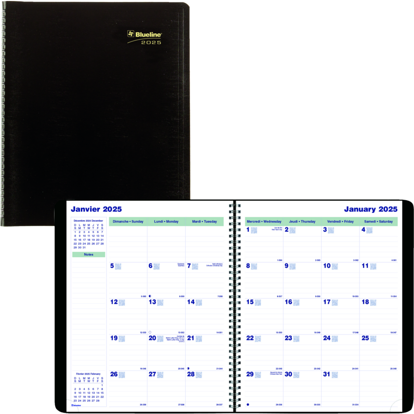 Contains a minimum of 50% post-consumer recycled material. FSC® Certified. Twin wire bound. Soft, lizard-like cover. Essential. Telephone and address section. 1 month per 2-page spread. 16 months, September to December. 11" x 9-1/16". Bilingual. Black.