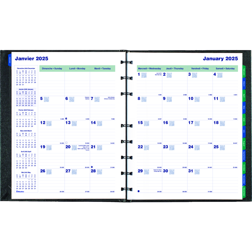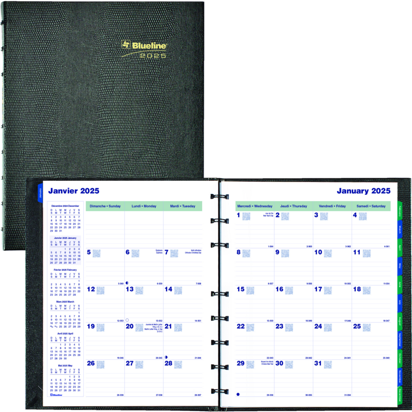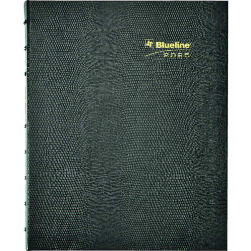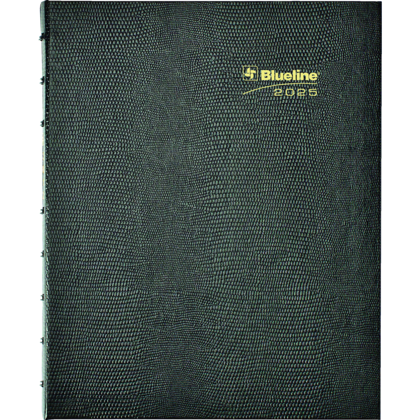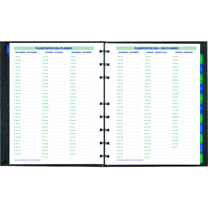 Contains a minimum of 50% post-consumer recycled material. FSC® Certified. Twin wire bound. Hard, lizard-like cover. 1 month per 2-page spread. 16 months, September to December. 30 MiracleBind™ ruled pages that can be removed and reinserted. Self-adhesive, laminated tabs and storage pocket. Black.